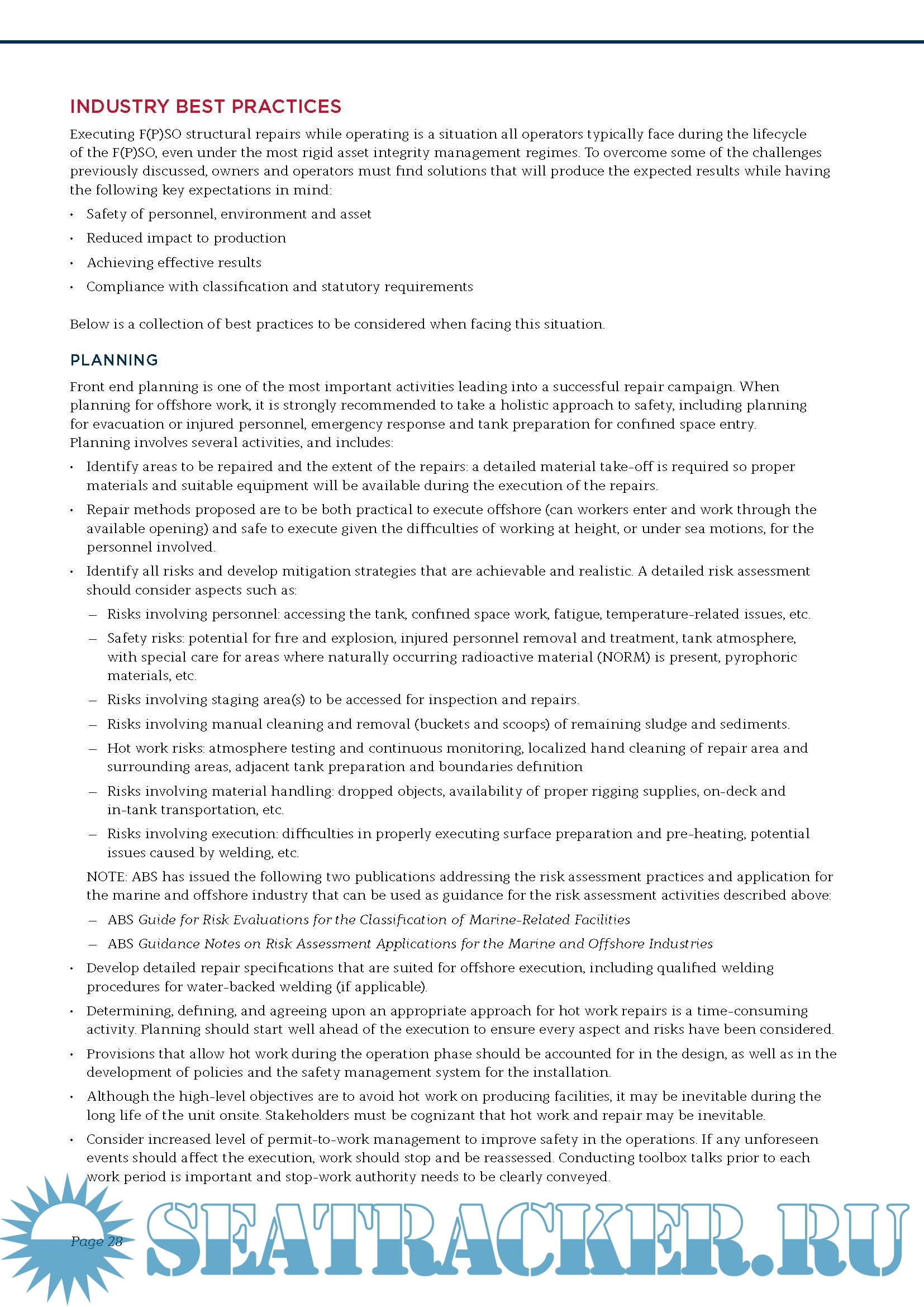 Year: 2022 Language: english Author: ABS Genre: Practical guide Format: PDF Quality: eBook Pages count: 40 Description: In this publication, ABS has worked together with a number of offshore operators to share information on best practices that can be applied across a diverse FPSO fleet. FPSOs of all types can potentially improve their operations and maintenance practices by utilizing the practices described herein. By working together as an industry to apply new tools, practices, and technology, we can achieve our mission of safer and more effective performance offshore.
