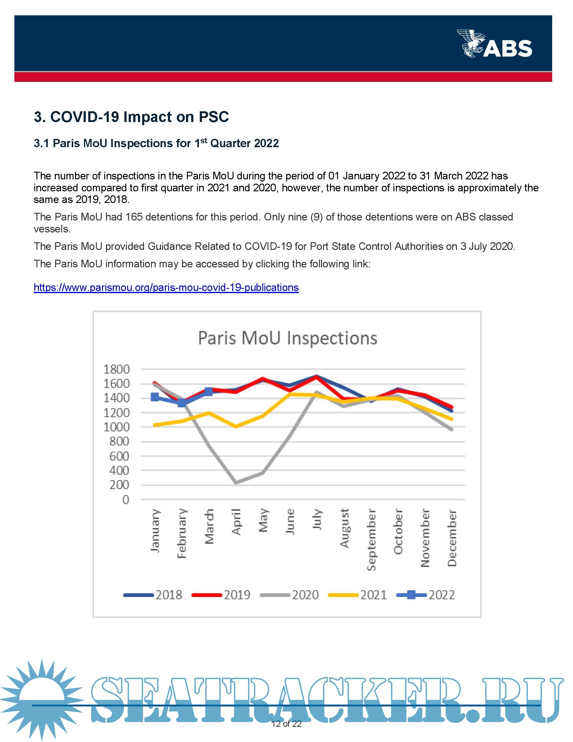 Description: This ABS Quarterly Report on Port State Control (PSC) provides information to owners on deficiencies identified on ABS vessels during inspections carried out by the various PSC regimes globally during the 1st Quarter of 2022. This report is being made available to assist owners by providing awareness of potential areas of concern that have been identified on ABS classed vessels.