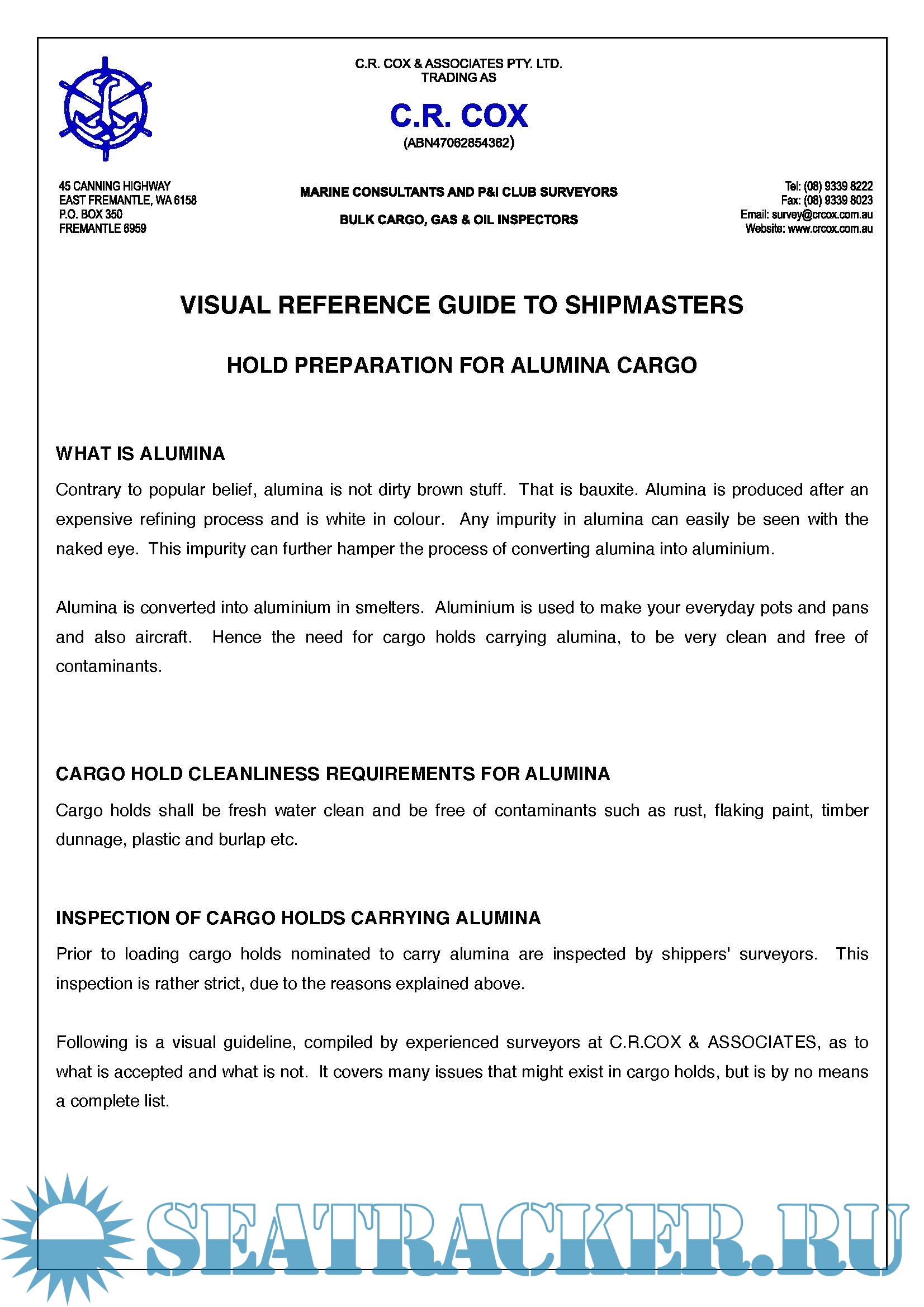 Year: 201x Language: english Author: C.R. COX Genre: Guide Format: PDF Quality: eBook Pages count: 17 Description: Following is a visual guideline/Visual Guide Cargo Hold Preparation for Alumina, compiled by experienced surveyors at C.R.COX & ASSOCIATES, as to what is accepted and what is not. It covers many issues that might exist in cargo holds, but is by no means a complete list.