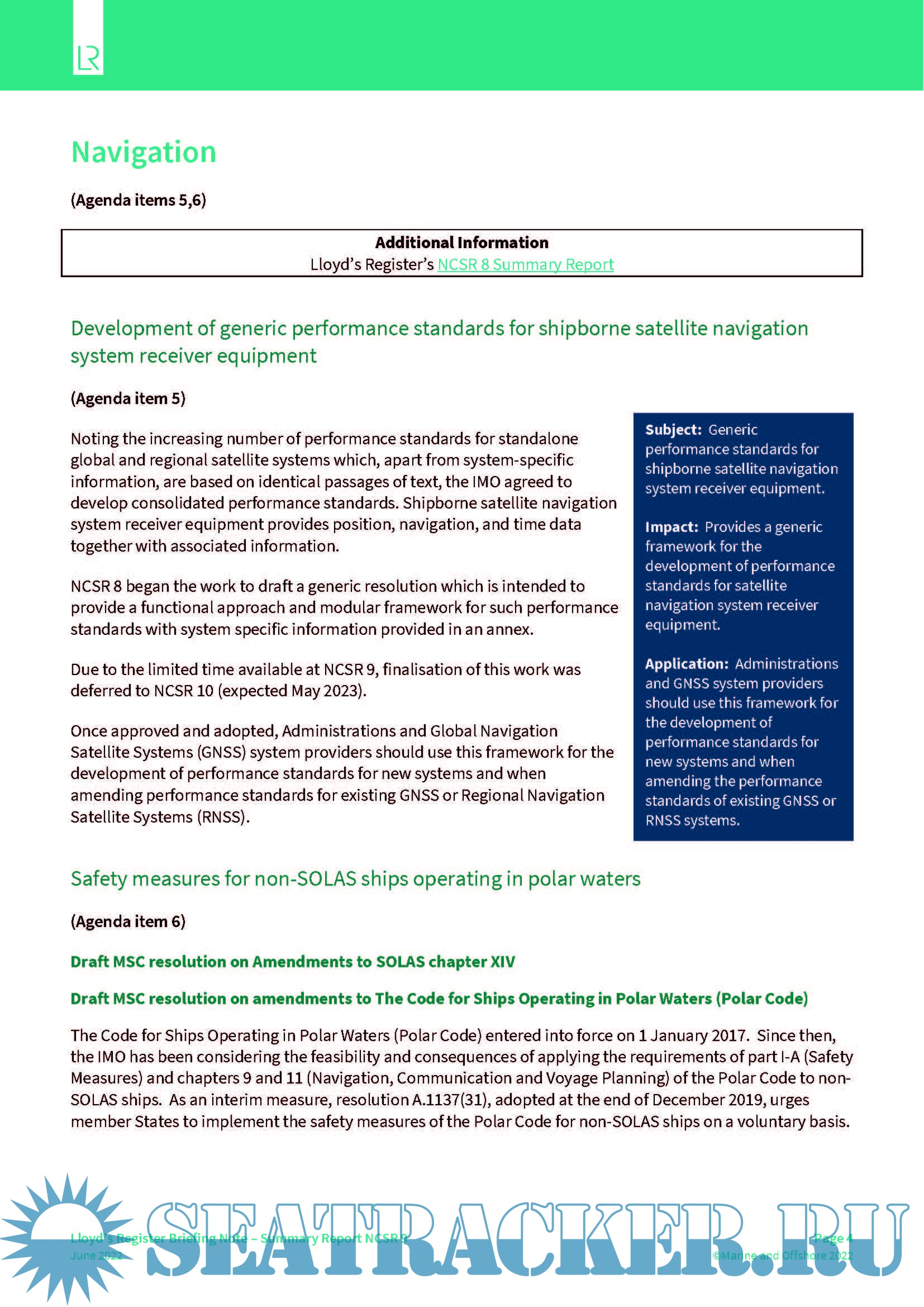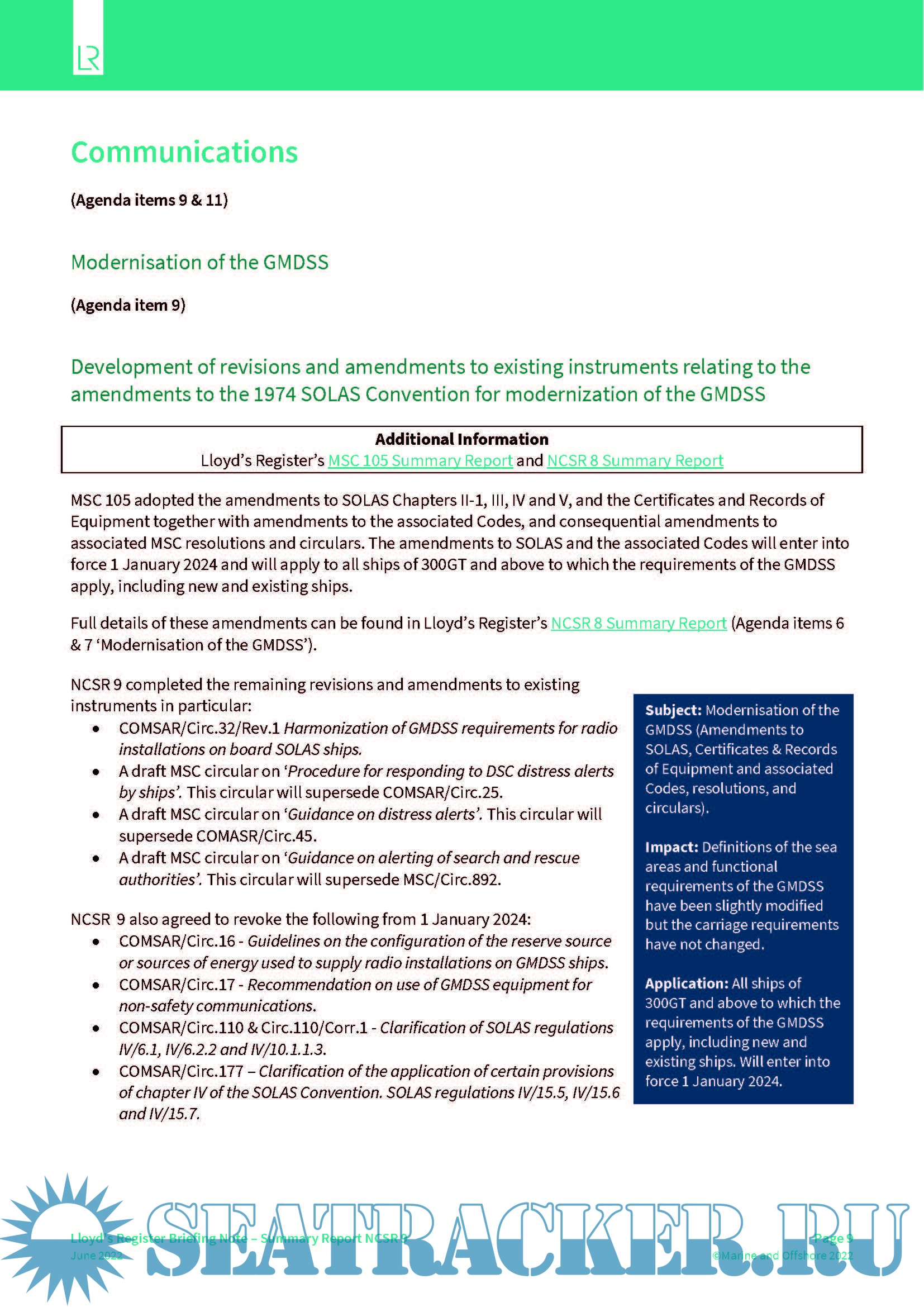 LR Summary Report for the IMO Navigation, Communications and Search and Rescue Ninth session (NCSR 9)