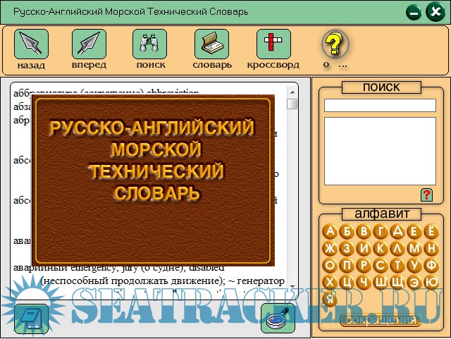 Год выпуска: 2001 Версия: 1.0 Разработчик: - Платформа: PC (Windows) Совместимость с Windows7: да Системные требования: Windows XP/7/8 Язык: русский, английский Язык интерфейса: только русский Таблэтка: Не требуется Описание: Словарь содержит около 25000 слов и терминов относящихся к * морскому делу, * эксплуатации, * классификации, * устройству и оборудованию судов морского флота, * торговым операциям, * морскому праву которые используют в практической деятельности судовые специалисты. Он включает терминологию как техническую, так и правовую, хозяйственную и бытовую, которую необходимо знать работникам на иностранных судах. Словарь рассчитан на широкий круг специалистов, инженерно-технических работников морского флота, курсантов и студентов специальных морских и речных учебных заведений. Все представлено в удобной оболочке. Имеется возможность поиска. + Словарь терминов на 80000 слов.