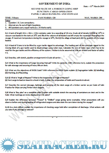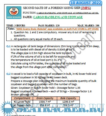 Question Paper Set for Cargo Handling and Stowage (August 2022) for Second Mate (F.G.) Mercantile Marine Department (MMD), India Examinations