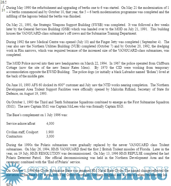 Description: For over forty years the Naval Base on the Garelach has provided a home for the United Kingdomssubamrine launched nuclear deterrent, initially the Resolution class submarines and latterly the Trident armed Vanguard class submarines.