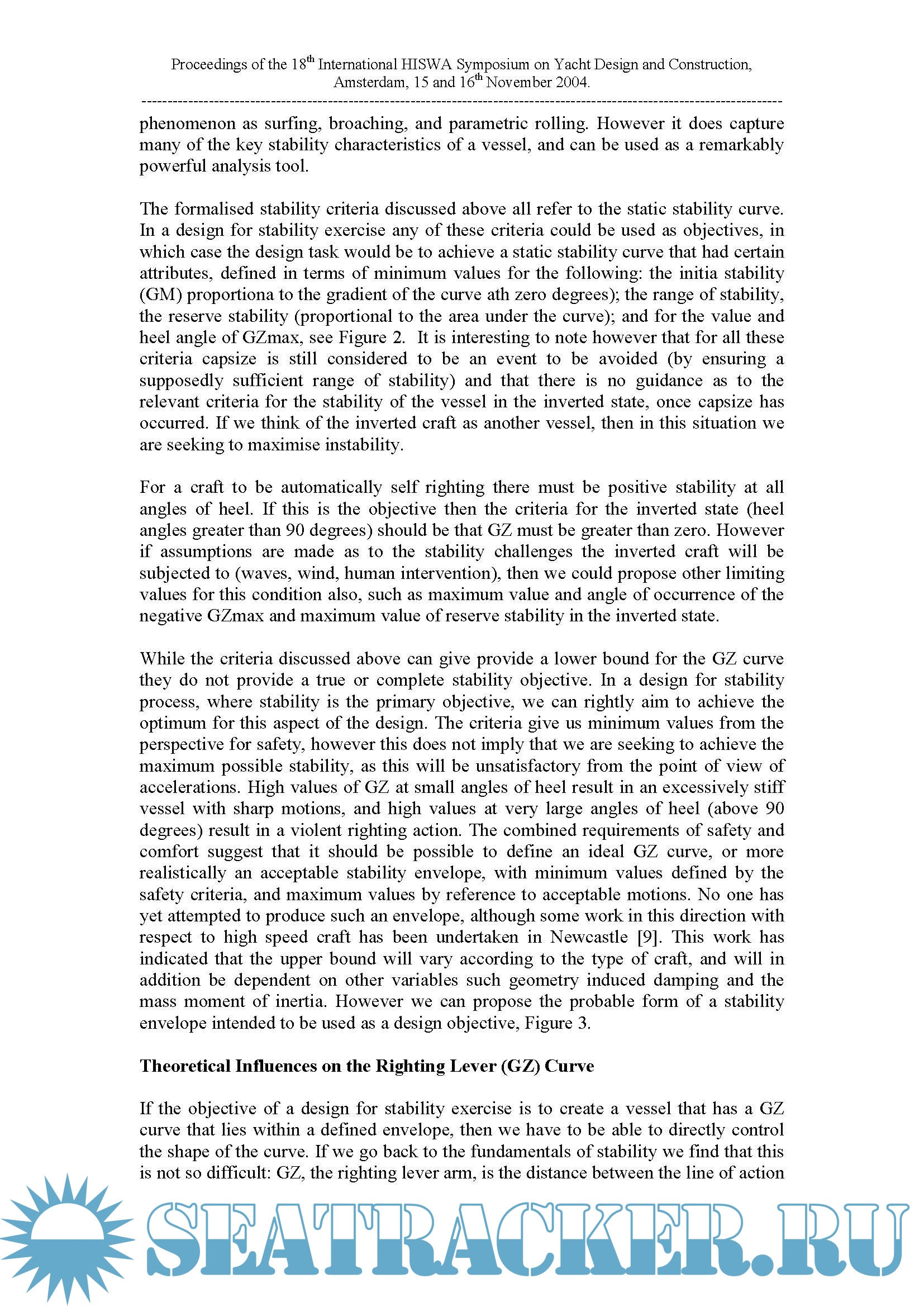 Year: 2004 Language: english Author: Richard Birmingham Genre: Conference Format: PDF Quality: OCR without errors Pages count: HISWA Description: The fundamentals of stability have been understood for over 200 years, however it is only in the last two decades that detailed consideration has been given to the stability behaviour of small craft at very high angles of heel, up to the completely inverted condition. The importance of this knowledge in the design of yachts and other small craft is considered, and the significance of our current understanding is reviewed in the context of procedures based on static stability analysis. The results of undertaking a design exercise with stability as the principal design driver is explored, and the practicality of such a procedure is discussed. Recent research that has produced results relevant to the stability of vessels in the inverted condition is briefly described and reviewed.