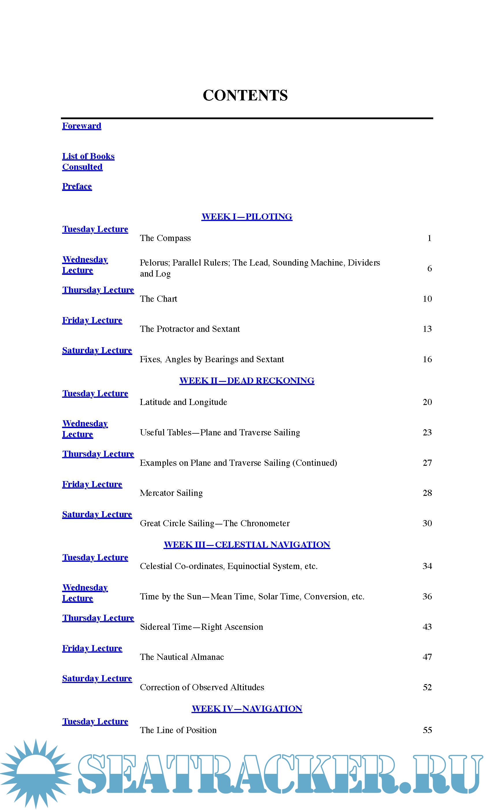 Year: 2008 Language: english Author: Ernest Gallaudet Draper Genre: Training courses Publisher: Project Gutenberg Edition: Dec 28, 2008 Format: EPUB/PDF Quality: eBook Pages count: 115 Description: These lectures have been written with the idea of explaining, in as simple language as possible, the fundamental elements of Navigation as set forth in Bowditch's American Practical Navigator. They will be given you during the time at the Training School devoted to this subject. At present this time includes two morning periods of one and a half hours each, separated by a recess of fifteen minutes. In general the plan is to devote the first period to the lecture and the second period to practical work. Not many examples for practical work have been included in this book, but one example, illustrating each new method, has been worked out. If you understand these examples you should be able to understand others similar to them. Toward the end of the course a portion of each second period will bedevoted to handling the sextant, work with charts, taking sights, etc. In short, every effort will be made to duplicate, as nearly as possible, navigating conditions on board a modern merchant ship.