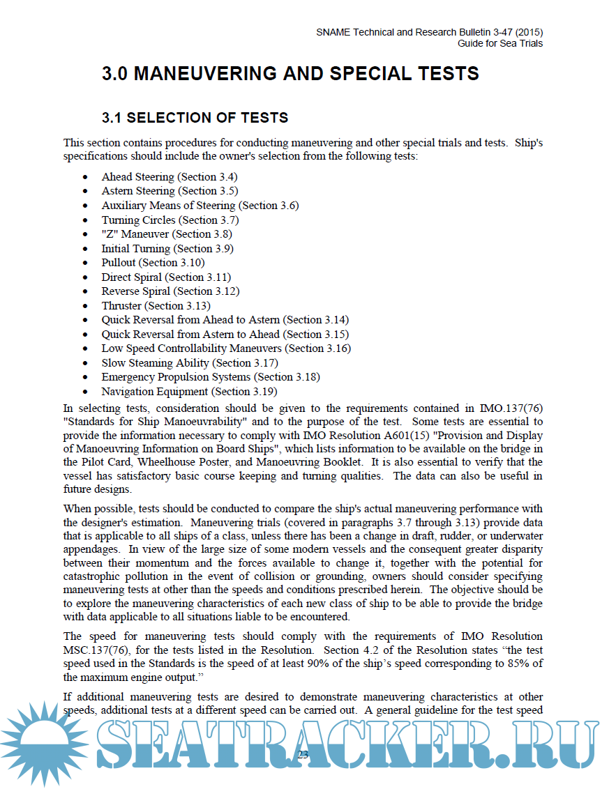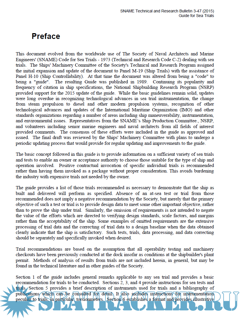 Description: This guide covers progressive speed, maneuvering, and endurance sea trials of self-propelled surface ships displacing 300 tonnes or more, powered by hydrocarbon fuels such as petroleum, natural gas or bio fuel, and driven by diesel or Otto cycle engines, gas turbine, or electric motors. References are made to applicable international standards. This Bulletin does not cover dock trials, tests, or demonstrations that can be conducted dockside, which are covered in SNAME T&R Bulletin 3-39, Guide for Shop and Installation Tests.