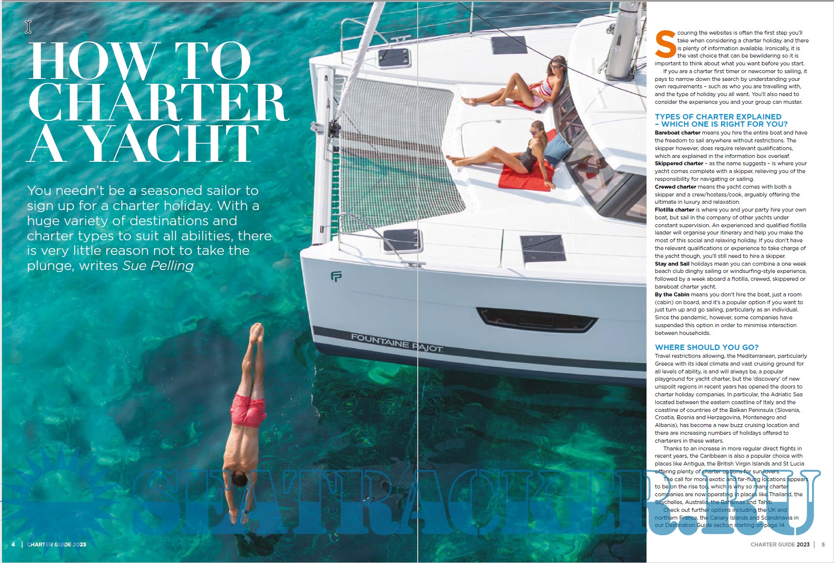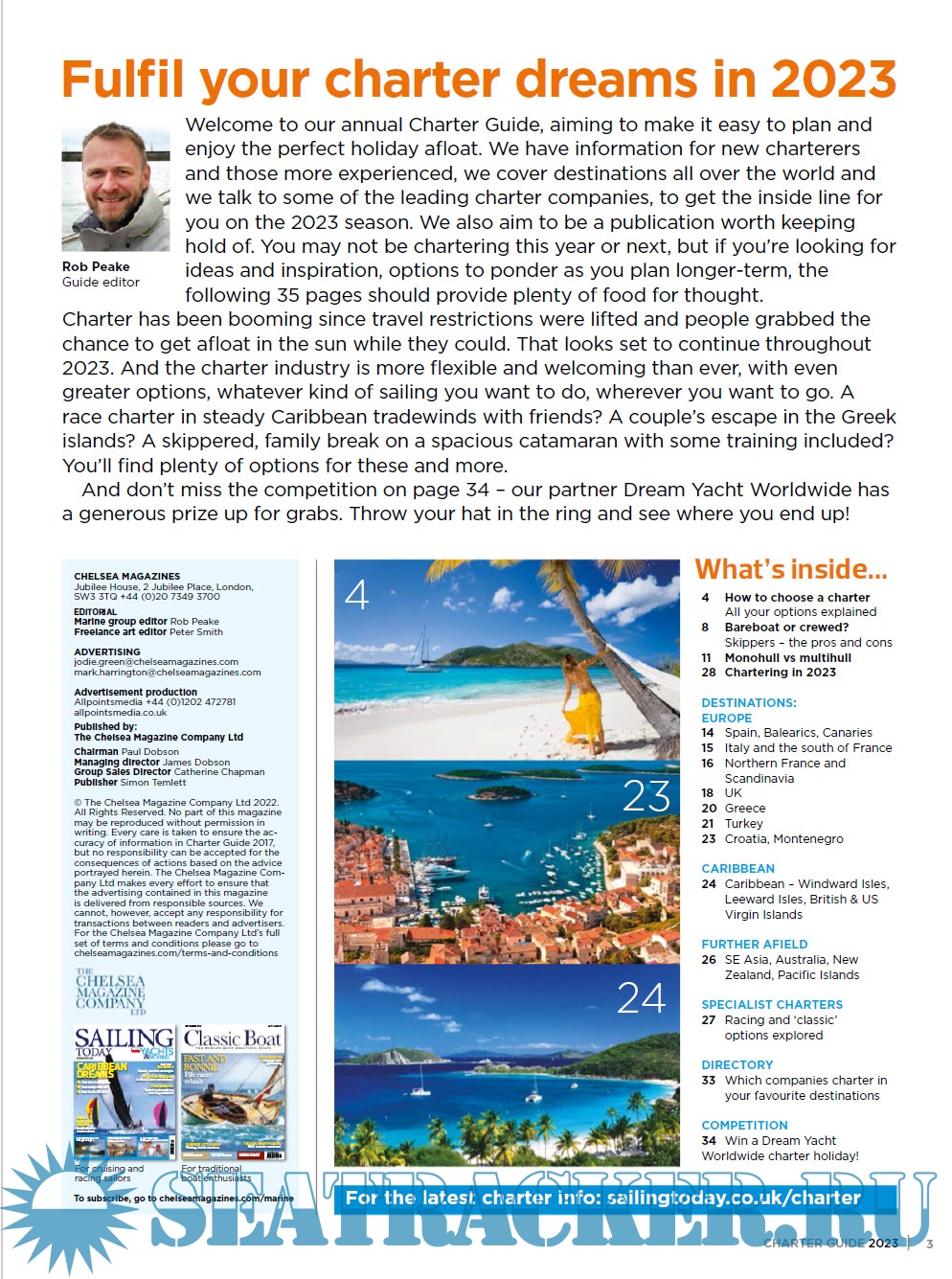 Description: Welcome to Sailing Today Charter Guide, aiming to make it easy to plan and enjoy the perfect holiday afloat. We have information for new charterers and those more experienced, we cover destinations all over the world and we talk to some of the leading charter companies, to get the inside line for you on the 2023 season. We also aim to be a publication worth keeping hold of. You may not be chartering this year or next, but if you are looking for ideas and inspiration, options to ponder as you plan longer-term, the following 36 pages should provide plenty of food for thought.
