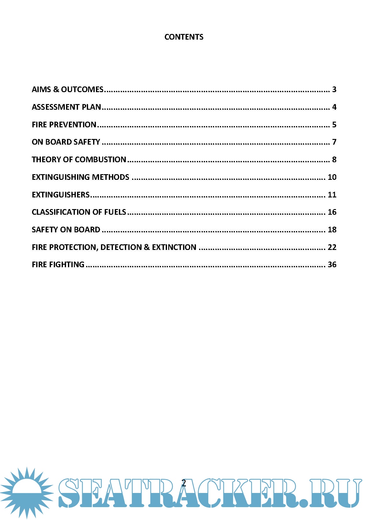 It deals with the theory of fire and how to prevent it, onboard safety in the event of a fire, use of portable