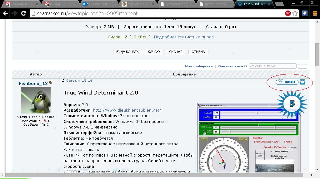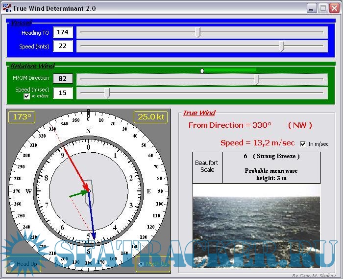 От которого мы получаем направление и скорость истинного ветра (ветер вектор красный), по шкале Бофорта, средняя высота волн.