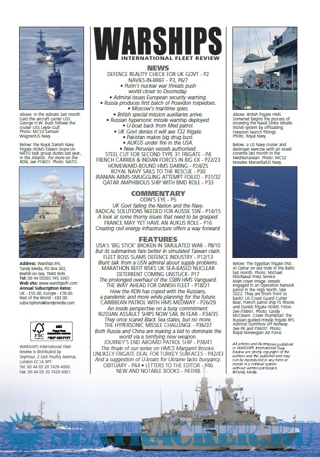 Description: Warships IFR puts the spotlight on the latest developments in the world’s navies. It covers current defence issues and has comments by leading analysts. The magazine regularly includes features on the Royal Navy and the US Navy in addition to incorporating news and features on all other navies across the globe. Warships IFR frequently carries in-depth articles on naval heritage.WARSHIPS International Fleet Review is published 12 times a year by Tandy Media Ltd who also publish Shipping Today & Yesterday (which provides news and features from the world of merchant shipping).Warships International Fleet Review monthly magazine issue Marsh, 2023