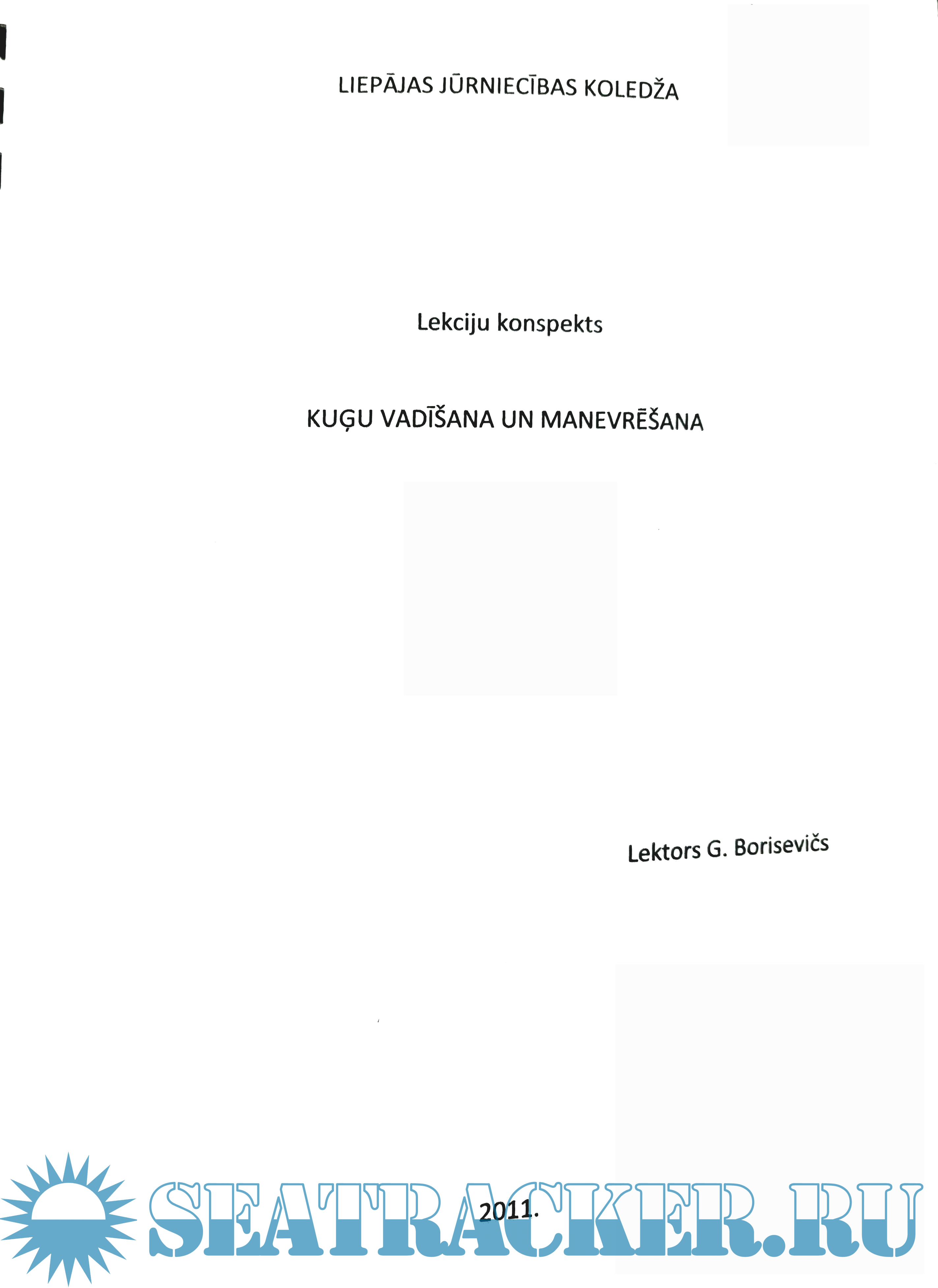 Year: 2011 Language: латышский Author: G. Borisevičs Genre: Курс лекций Publisher: Liepājas Jūrniecības Koledža Format: PDF Quality: Scanned pages + text layer Number of pages: 100 Description: Vispārējā izpratne par kuģi Korpusa konstrukcija Kuģa iekārtas Kuģu sistēmas Kuģa telpas Vispārīgas ziņas par kuģa vadāmību Kuģa cirkulācija. Vadāmība Kuģa inerces īpašības Kuģa vadīšana uzņemot un nododot loci Kuģa vadīšana un manevrēšana avārijas situācijās Kuģa tauvošanas operācijas Kuģa enkurvieta Kuģa vadīšana kuģojot ledus apstākļos Kuģošana ledlauža pavadībā Kuģu vilkšana Kuģa vadīšana vētras laikā Kuģa noņemšana no sēkļa Vilkšanas operācijas avārijas gadījumā Nenogremdējamība Stūres pievads Papildus prasības elektriskajiem un elektrohidrauliskajiem stūres pievadiem Piestūrēšanas ierīces Remonts un kuģu remontu tehnoloģija