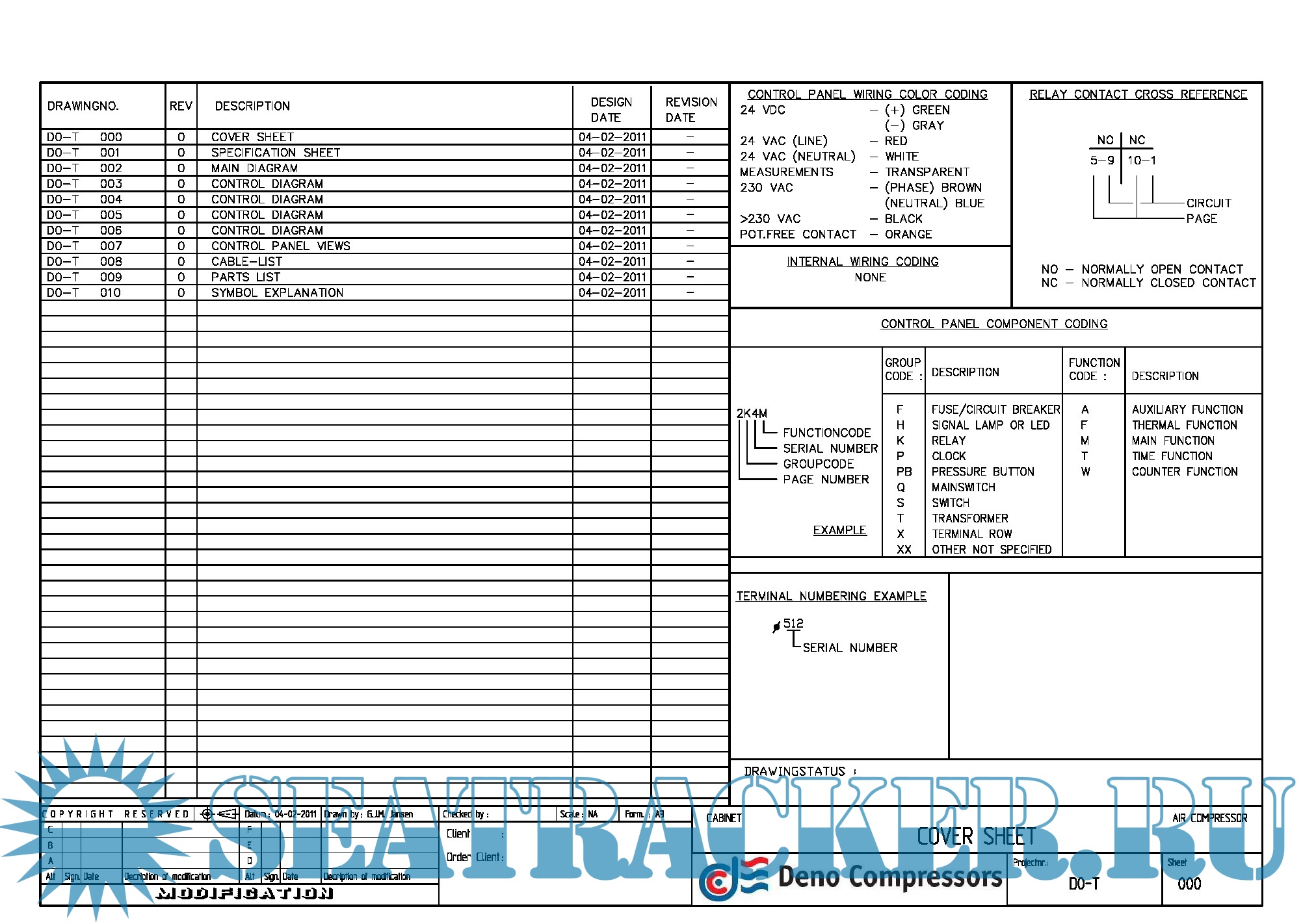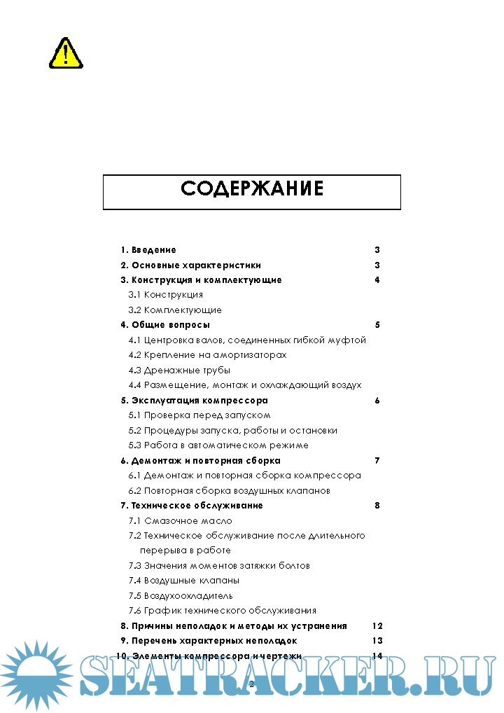Год выпуска: 2014 Язык: Русский, Английский Автор: www.denocomp.nl Формат: PDF Качество: Изначально компьютерное (eBook) Количество страниц: 58 Описание: Компрессор DENO, модель L2-25 - это двухступенчатый компрессор одностороннего действия с воздушным охлаждением, который, в основном, используется для запуска как судовых, так и береговых дизельных двигателей. Он также широко применяется в качестве основного источника воздуха высокого давления, например, при проведении испытаний давлением и работе пневматических приспособлений и устройств. Особенностями модели являются компактная и легкая конструкция, требующая минимального пространства для установки. Кроме того, особое внимание уделено конструкции, которая обеспечивает надежность и длительность работы при определенных условиях эксплуатации. Более того, в компрессорах с воздушным охлаждением для обеспечения стабильной работы и снижения затрат на текущее обслуживание особое внимание уделено поддержанию баланса давления в каждой ступени и эффективному охлаждению компрессора. Все материалы, используемые при производстве компрессора, высокого качества и тщательно протестированы в соответствии с требованиями классификационных обществ. Приборы поставляются в соответствии с требованиями классификационных обществ, и, если необходимо, компрессор может быть оснащен оборудованием для полностью автоматизированной работы. До начала работы просим операторов и обслуживающий персонал внимательно прочитать эту инструкцию для наиболее эффективной эксплуатации компрессора.