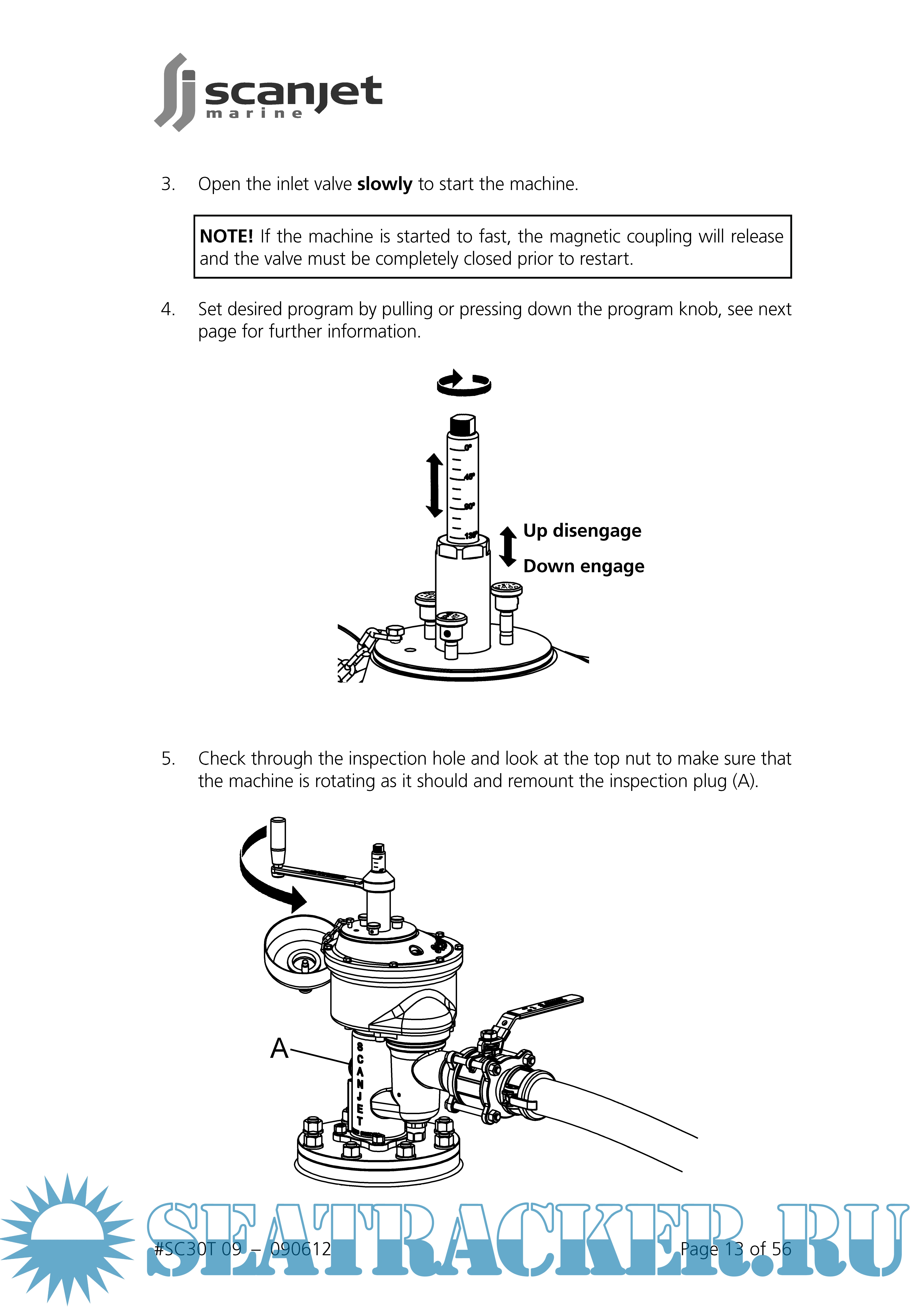 Year: 2009 Language: english Author: www.scanjet.se Genre: Manual Format: PDF Quality: eBook Pages count: 56 Description: SCANJET model SC30T is a tank cleaning machine specially developed for cleaning of cargo and slop tanks on board chemical/product carriers. The size, construction and cleaning requirements of these tanks are design criteria, which have been evaluated prior to installation in your vessel. SC30T tank cleaning machine consists of two main parts; a washing unit that is fixed installed in deck and a turbine driven drive unit. The cleaning procedure will start by opening the valve for cleaning media. The drive unit will now turn the main pipe and lift the nozzle creating a horizontal spiral-cleaning pattern. When the cleaning procedure is finalized the valve is to be closed. This manual has been prepared as a guide for the persons who will be operating and maintaining your tank cleaning machine. The key for long life for your tank cleaning machine will always be a system of carefully planned maintenance. Your tank cleaning machine is actually doing a rough and dirty job for you. Keep up the maintenance and the Scanjet SC30T will keep servicing you for many years.
