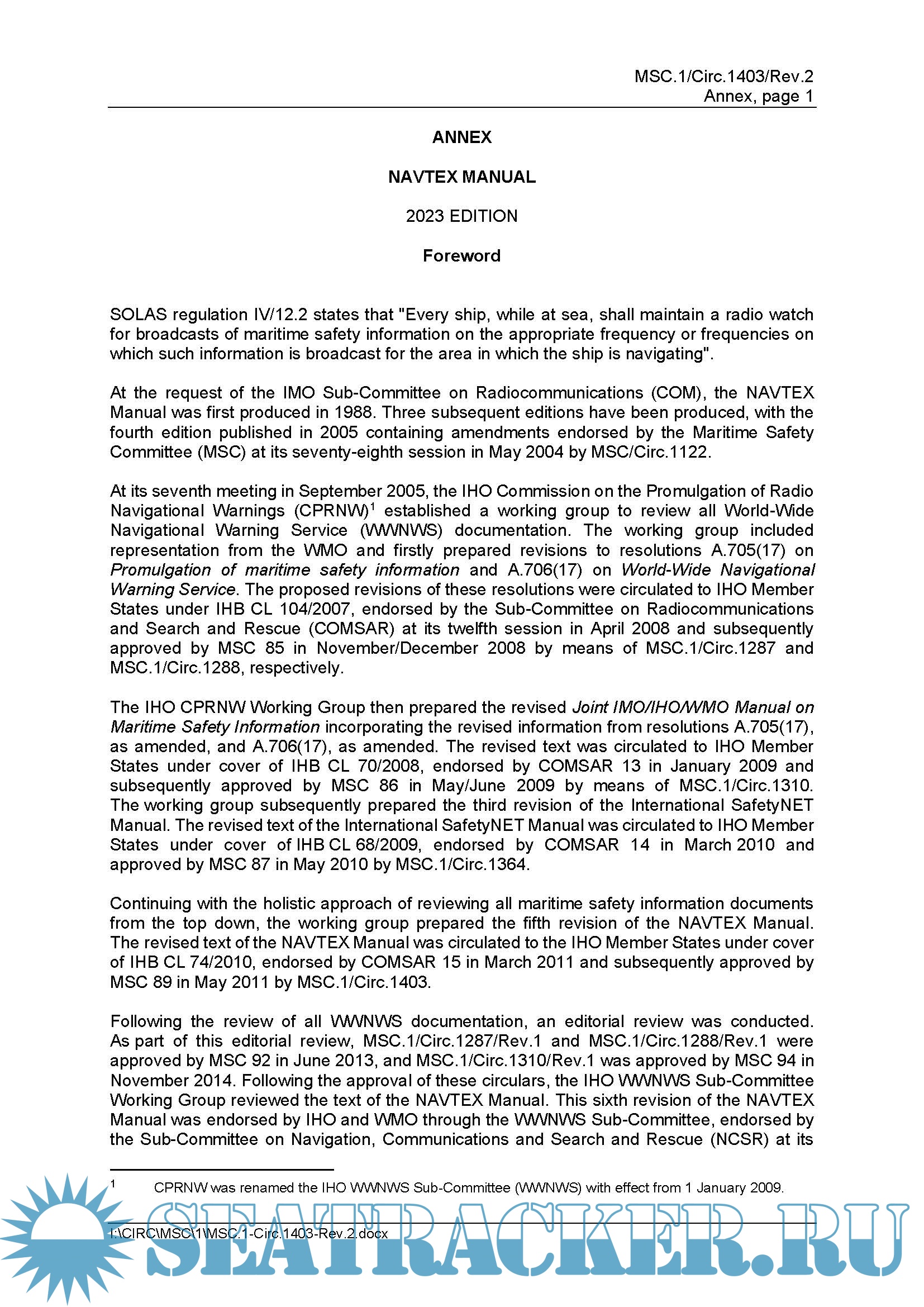 This Manual is intended for use by maritime Administrations, seafarers, shipowners and others concerned with preparing, broadcasting and receiving maritime safety information. The 2023 edition of the Manual came into effect on 1 January 2023 and includes the revised Performance standards for the reception of maritime safety information and search and rescue related information by MF (NAVTEX) and HF (resolution MSC.508(105)) and the revised Criteria for use when providing a NAVTEX service (resolution MSC.509(105), annex 4).