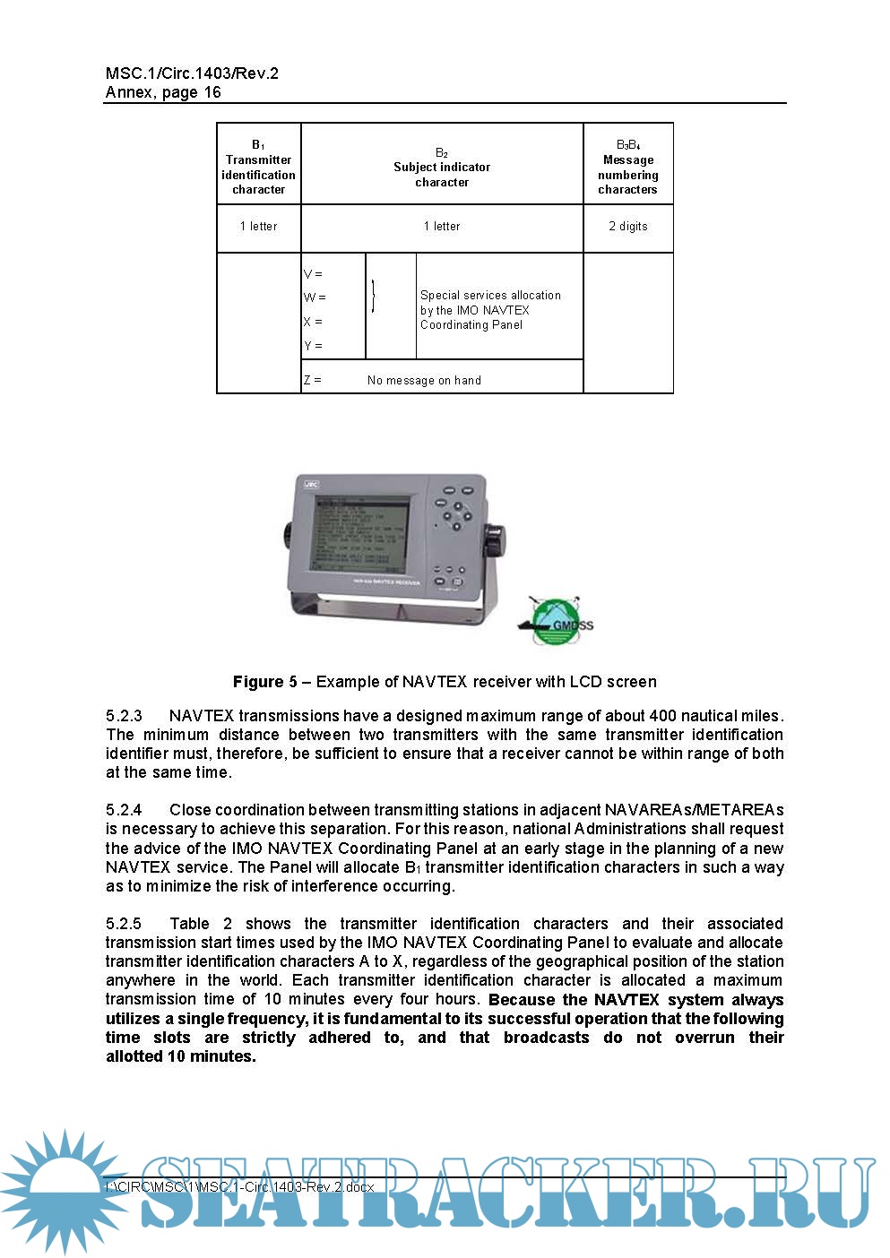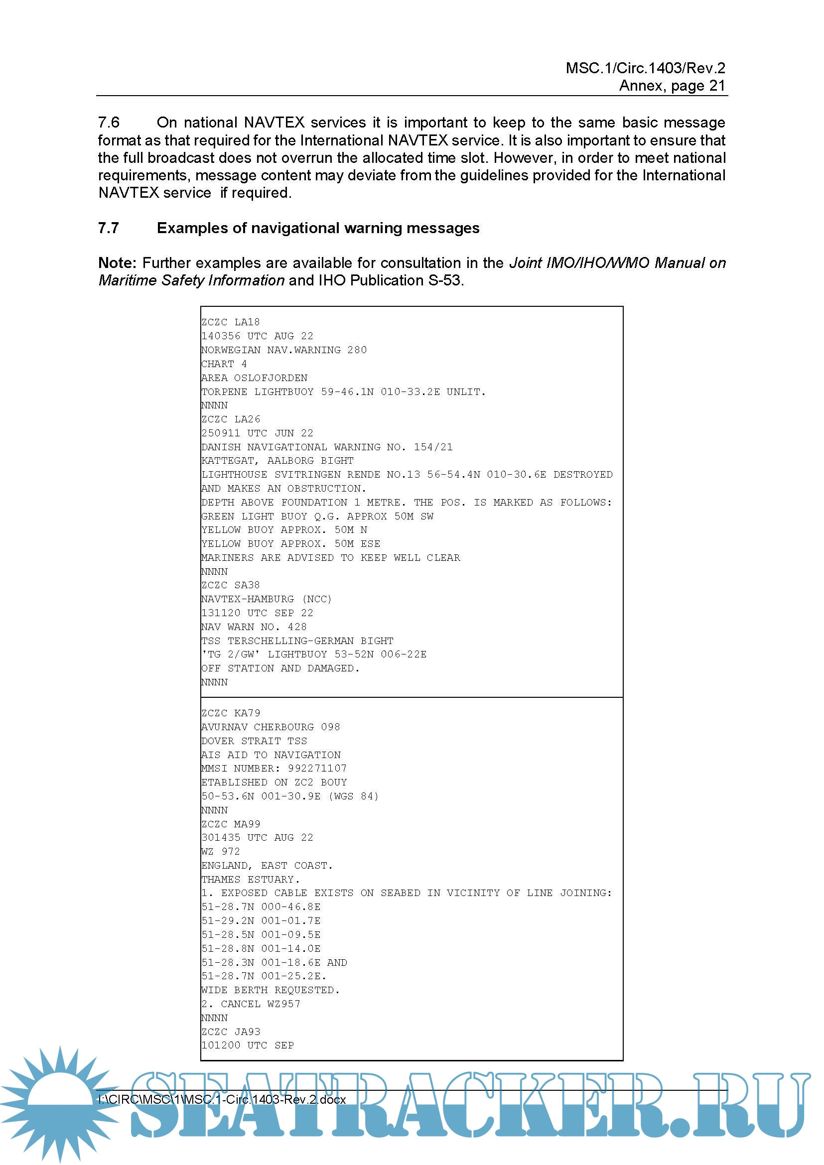 1 General information 2 NAVTEX service 3 General features of the NAVTEX system 4 Establishing or withdrawing NAVTEX services 5 NAVTEX message technical characters 6 Message identity 7 Message format 8 Language and national broadcast options 9 Information control 10 Message content 11 Message priorities and broadcast procedures in the international NAVTEX service 12 Responsibilities of a NAVTEX coordinator 13 Best practice for those using the service 14 Mutual interference between NAVTEX stations 15 Notification of NAVTEX services Annex 1 IMO NAVTEX Coordinating Panel Annex 2 Procedure for amending the NAVTEX Manual IMO Resolution MSC.508(105) IMO Resolution MSC.509(105)