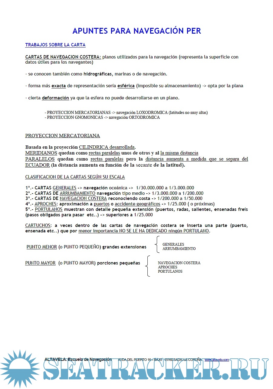 - Sistema de medir los rumbos, Circular, Cuadrantal y Por cuartas - Errores de la aguja del compás. Declinación magnética, Desvío y Corrección total - Situación en la carta. Latitud y Longitud - Medida de distancias en la carta - Encontrar rumbos en la carta - Situación con distancias a dos puntos de la costa - Problema con enfilaciones, oposiciones y línea isobática - Navegación por estima en la carta - Navegación con viento - Navegación con corrientes - Trazado y medida de demoras - Obtener una situación con dos demoras, por demora y enfilación - Situación por marcaciones - Obtener Situación por demoras, marcaciones, enfilación u oposición y línea isobática - Obtener la corrección total con dos demoras