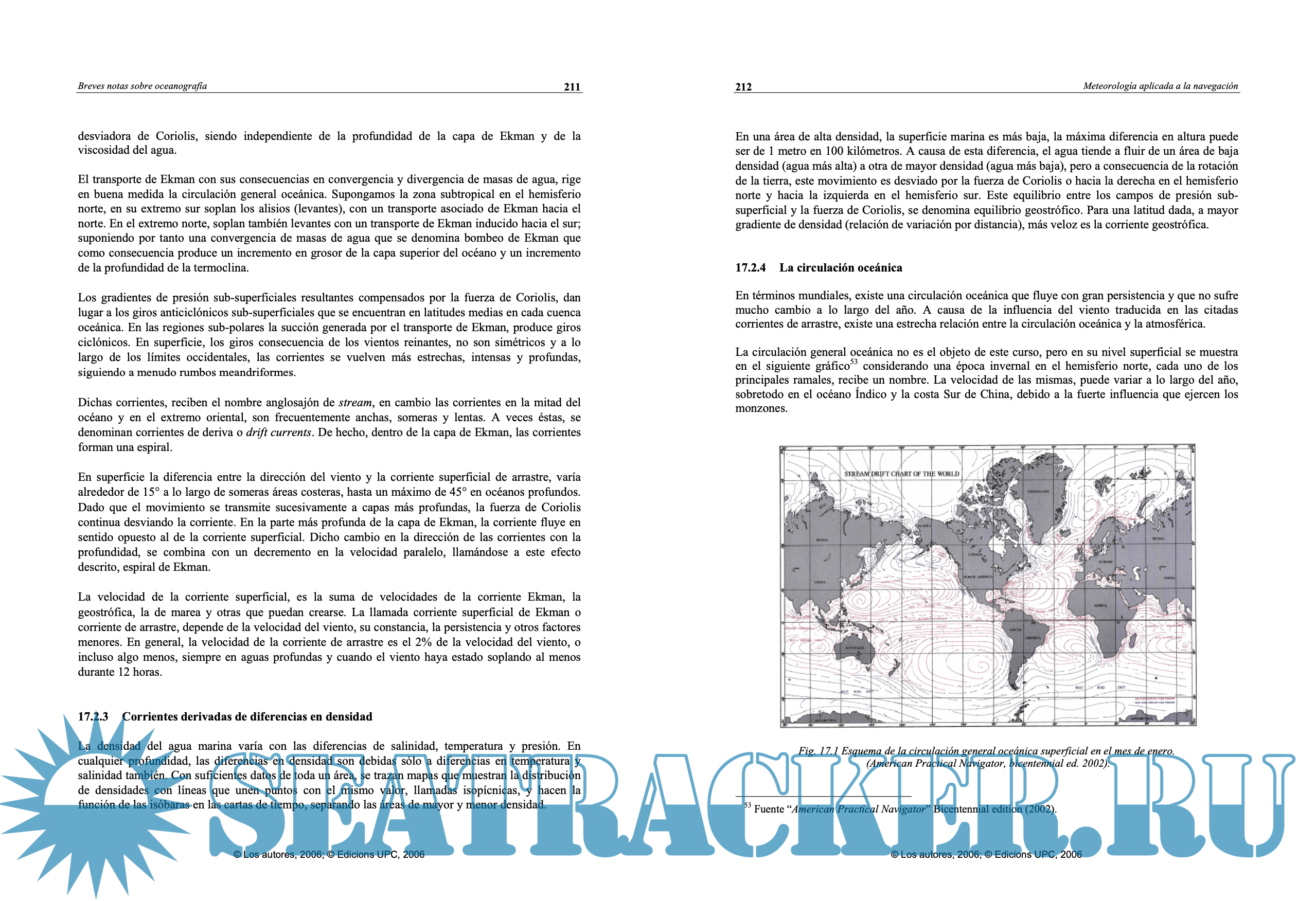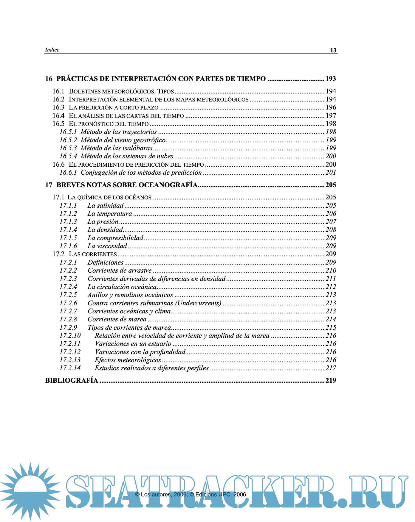 Year: 2006 Language: spanish Author: Martínez de Osés, Francesc Xavier Genre: Manual Publisher: Edicions UPC Edition: 2nd ISBN: 9788498802269 Format: PDF Quality: eBook Pages count: 220 Description: El presente libro pretende ser fundamentalmente una herramienta de trabajo para los alumnos de la Licenciatura en Náutica y los más avezados de la Diplomatura en Náutica y Transporte Marítimo de las facultades y escuelas superiores de la Marina Civil de habla hispana. La obra se inicia con un breve repaso al capítulo energético que provee de energía a la atmósfera y que constituye la base combustible de la maquinaria meteorológica. Posteriormente se repasan someramente los criterios de estabilidad del aire, que justifican la formación de centros de presión y la formación de nubes. Tras sentar estas bases, se presenta la circulación general atmosférica y sus consecuencias, así como el papel del viento como igualador de los desequilibrios atmosféricos. Al tratarse de una obra dirigida a los estudiantes de náutica, se relaciona el viento con la formación de las olas. Se distinguen los conceptos de meteorología y climatología, y se analiza el instrumental utilizado en la observación meteorológica. A continuación se aborda la cuestión de la observación y la predicción, que quizás sea la parte que el observador a bordo más necesitaba ver compendiada y que tenía que consultar en otras publicaciones quizá de más rigor científico, pero dirigidas a otro público. Finalmente, se introducen los sistemas usuales de consulta del tiempo por parte del marino, y la obra concluye con un ejemplo de interpretación del parte del tiempo. This book is intended primarily to be a working tool for students of Nautical studies and the most advanced students of Nautical and Maritime Transport of the colleges and colleges of the Spanish-speaking Civil Navy. The work begins with a brief review of the energy chapter that provides energy to the atmosphere and is the fuel base of the meteorology machinery. The criteria for the stability of the air, which justify the formation of pressure centres and the formation of clouds, are subsequently re-examined. After laying these foundations, the general air circulation and its consequences, as well as the role of the wind as equalizer of atmospheric imbalances, are presented. As it is a work for the nautical students, the wind is linked to the formation of the waves. The concepts of meteorology and climatology are distinguished, and the instrumentation used in the meteorology observation is analyzed. The question of observation and prediction is addressed, which may be the part that the observer on board most needed to see compendiated and that he had to consult in other publications perhaps more scientific, but directed to another audience. Finally, the seafarer's usual time-reference systems are introduced, and the work concludes with an example of interpretation of the part of time.