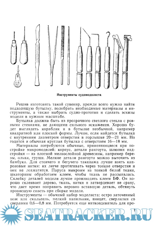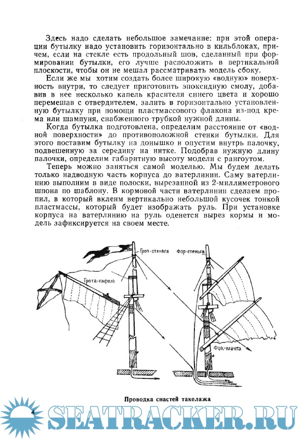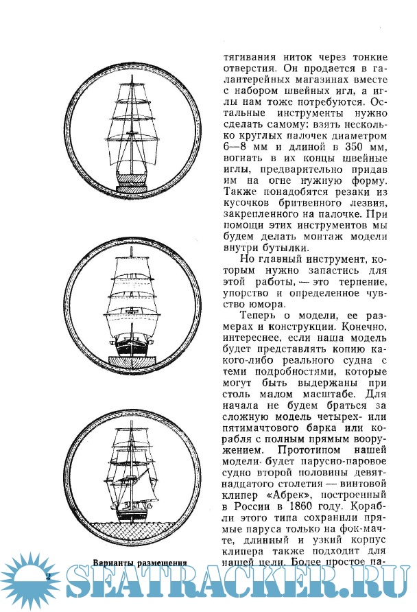 Первая, самая простая модель двухмачтовой шхуны была установлена в бутылке при помощи несложных, изготовленных в процессе работы, инструментов. Затем, постепенно усложняя задачу, удалось найти простые приемы, помогающие поместить в бутылку судно с прямыми парусами и тремя — четырьмя мачтами. _