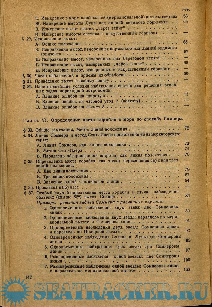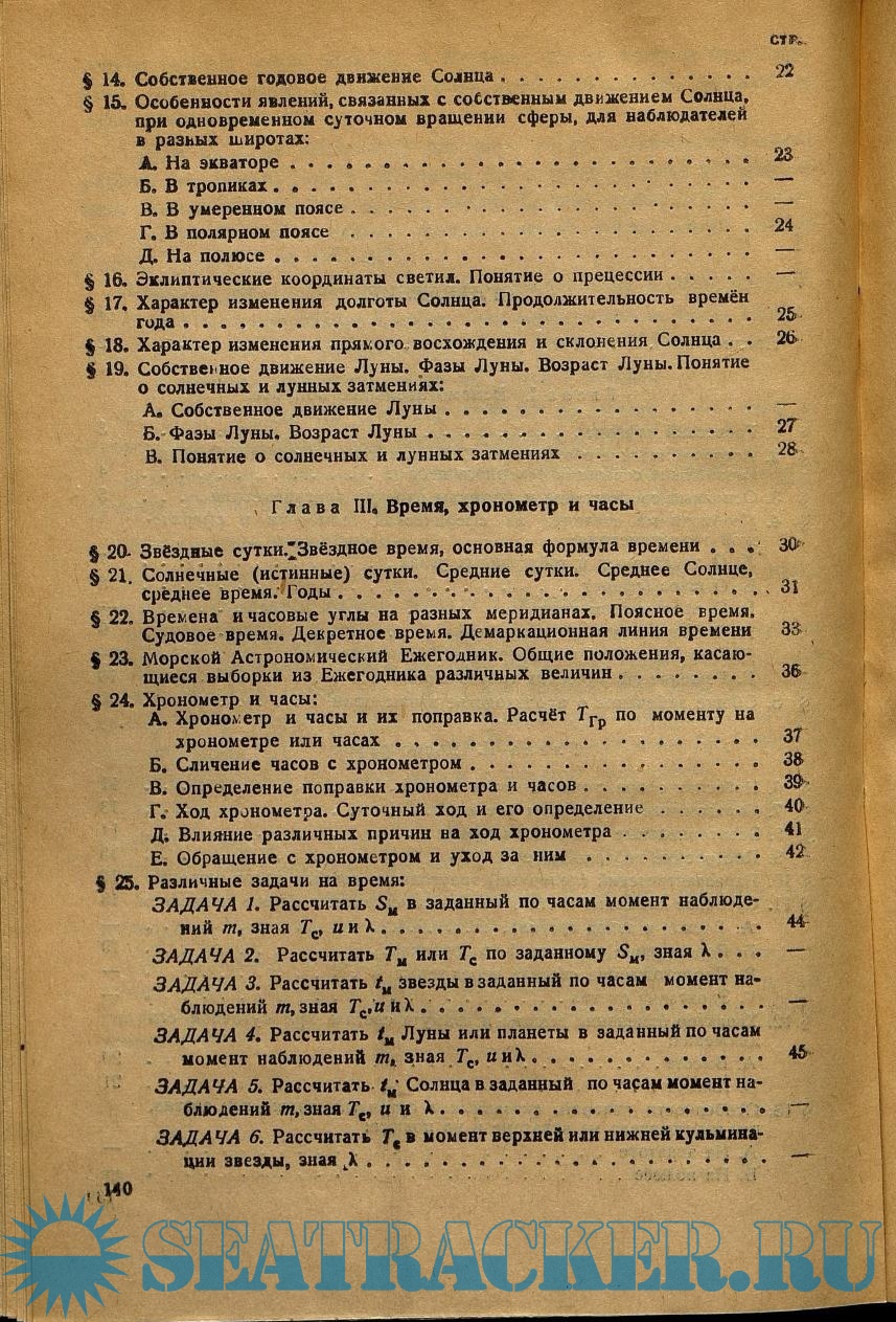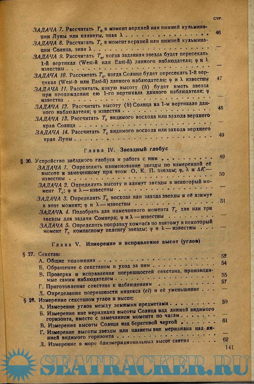Год выпуска: 1946 Язык: русский Автор: Хлюстин Б.П. Жанр: Учебное пособие Издательство: Морской транспорт Формат: PDF Качество: Отсканированные страницы Количество страниц: 154 Описание: Греческий алфавит. Астрономические обозначения Солнца, планет и созвездий Зодиака. Главнейшие созвездия северного неба. Основные соотношения и формулы плоской тригонометрии. Необходимые сведения из сферической геометрии и сферической тригонометрии. Общие замечания о производстве вычислений. Небесная сфера, точки и круги на ней. Горизонтальные координаты светил. Экваториальные координаты светил. Построение небесной сферы. Параллактический (полярный) треугольник светила и его решение. Суточное движение светил, и явления, связанные с этим движением. Характер изменения высоты и азимута светила при суточном его движении. Особенности явлений, связанных с суточным движением светил, для наблюдателя на экваторе и на полюсе. Собственное годовое движение Солнца. Особенности явлений, связанных с собственным движением Солнца, при одновременном суточном вращении сферы, для наблюдателей в разных широтах. Эклиптические координаты светил. Понятие о прецессии. Характер изменения долготы Солнца. Продолжительность времён года. Характер изменения прямого восхождения и склонения Солнца. Собственное движение Луны. Фазы Луны. Возраст Луны. Понятие о солнечных и лунных затмениях. Звёздные сутки. Звёздное время, основная формула времени. Солнечные (истинные) сутки. Средние сутки. Среднее Солнце, среднее время. Годы. Времена и часовые углы на разных меридианах. Поясное время. Судовое время. Декретное время. Демаркационная линия времени. Морской Астрономический Ежегодник. Общие положения, касающиеся выборки из Ежегодника различных величин. Хронометр и часы. Различные задачи на время. Устройство звёздного глобуса и работа с ним. Секстан. Измерение секстаном углов и высот. Исправление высот. Число наблюдений и приёмы их обработки. Приведение высот к одному зениту. Наивыгоднейшие условия наблюдения светил для решения основных задач мореходной астрономии. Метод линий положения. Линия Сомнера и метод Сент-Илера проложения её на меркаторскую карту. Определение места корабля как точки пересечения двух или трех линий положения. Прокладка на бумаге. Особый случай определения места корабля в случае наблюдения больших (свыше 88 градусов) высот Солнца. Определение широты по близмеридиональным высотам светил. Определение долготы по высоте светила. Определение общей поправки компаса. Нормы времени для производства наблюдений и для решения различных астрономических задач. Указания штурману.