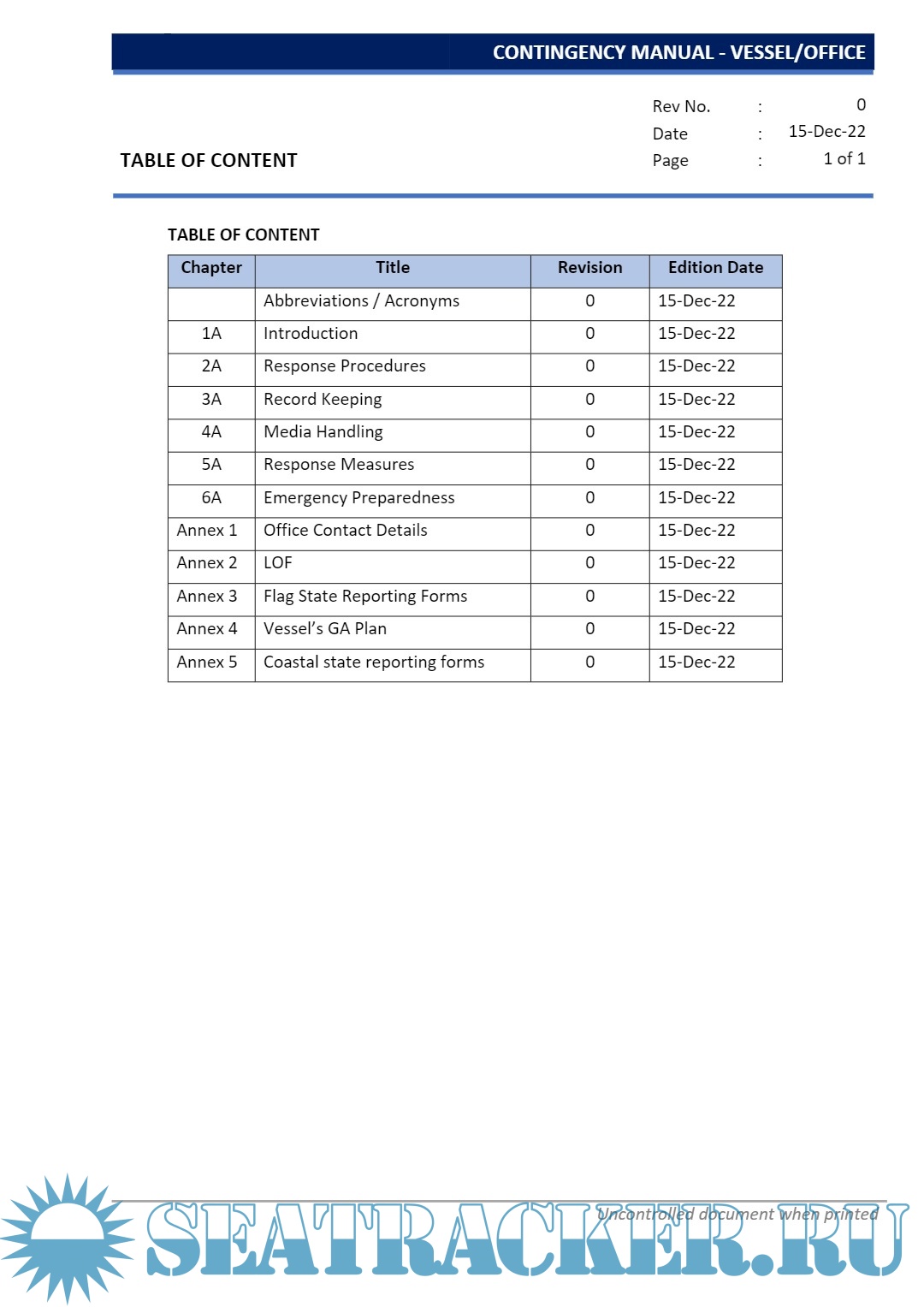 Description: The Contingency Manual provides guidelines and instructions that assist in making an efficient response to emergency situations onboard ships.