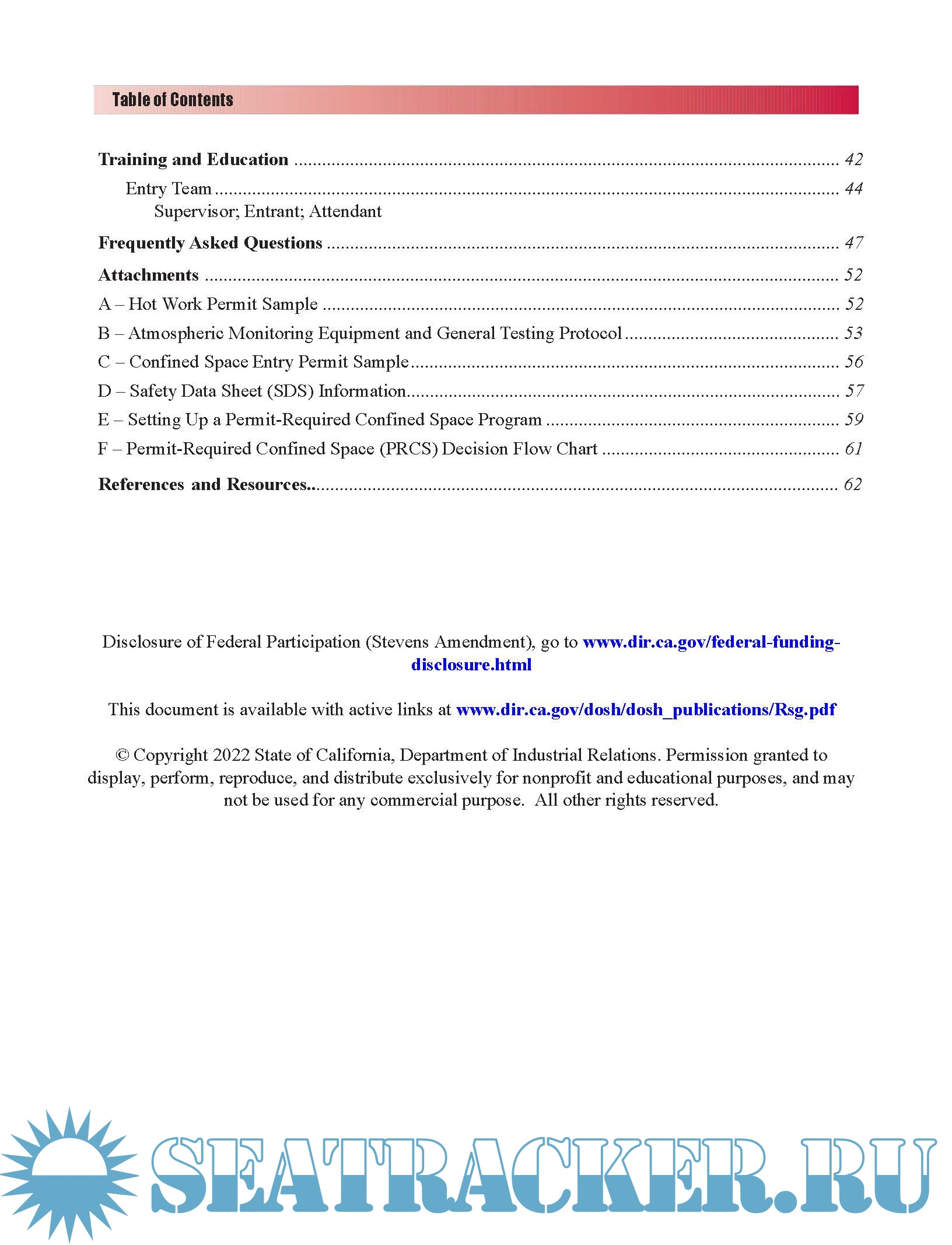 Description: At the back of this guide, there are six attachments intended to further assist employers who are starting to learn about confined spaces or for those who wish to improve an existing program. Attachments A through D provide samples of hot work and permit-required confined space entry forms, SDS, atmospheric monitoring equipment information, and general testing protocols. Attachment E, “Setting Up a Permit-Required Confined Space Program,” contains easy, step-by-step instructions for required and suggested actions in the implementation of a confined space program that meets regulatory requirements. Attachment F, “Permit-Required Confined Space (PRCS) Decision Flow Chart,” helps employers to determine the required entry procedure as defined by the confined space standard.