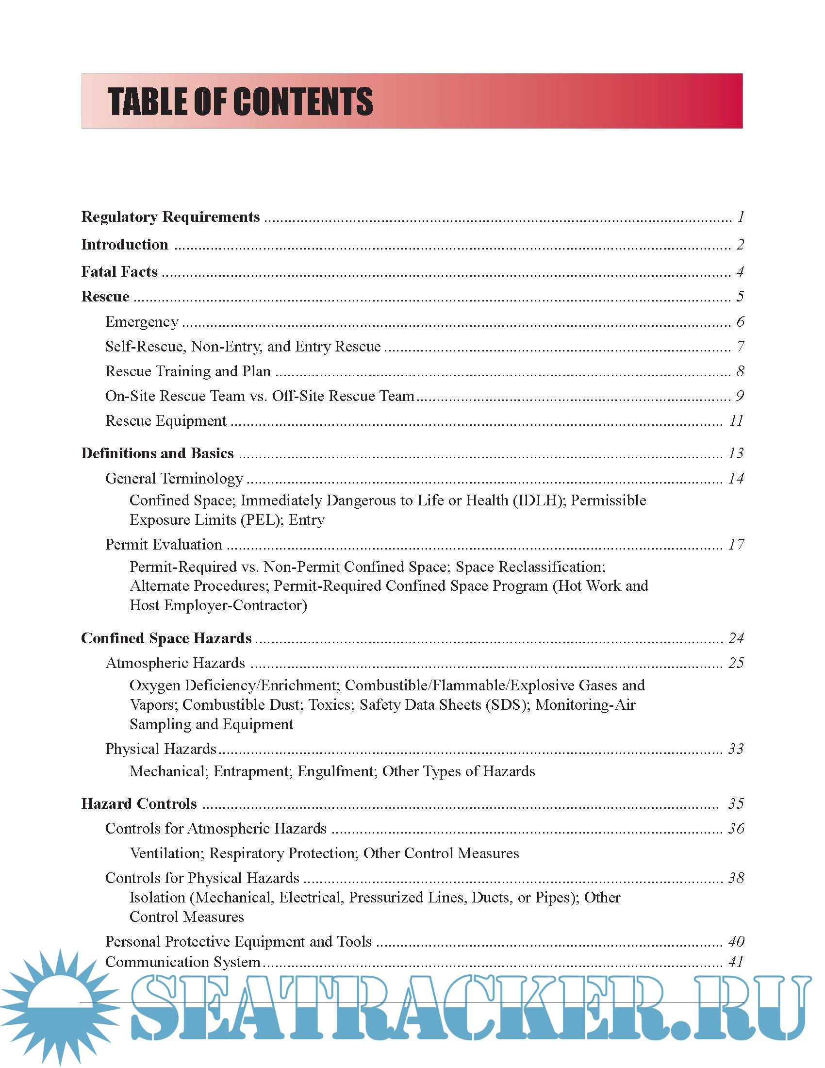 Regulatory Requirements 1 .................................................................................................................... Introduction 2 .......................................................................................................................................... Fatal Facts 4 ............................................................................................................................................. Rescue 5 .................................................................................................................................................... Emergency 6 ........................................................................................................................................ Self-Rescue, Non-Entry, and Entry Rescue 7 ...................................................................................... Rescue Training and Plan 8 ................................................................................................................. On-Site Rescue Team vs. Off-Site Rescue Team 9 .............................................................................. Rescue Equipment 11 .......................................................................................................................... Definitions and Basics 13 ........................................................................................................................ General Terminology Confined Space; Immediately Dangerous to Life or Health (IDLH); Permissible Exposure Limits (PEL); Entry 14 ...................................................................................................................... Permit Evaluation Permit-Required vs. Non-Permit Confined Space; Space Reclassification; Alternate Procedures; Permit-Required Confined Space Program (Hot Work and Host Employer-Contractor) 17 ........................................................................................................................... Confined Space Hazards 24 .................................................................................................................... Atmospheric Hazards Oxygen Deficiency/Enrichment; Combustible/Flammable/Explosive Gases and Vapors; Combustible Dust; Toxics; Safety Data Sheets (SDS); Monitoring-Air Sampling and Equipment 25 ..................................................................................................................... Physical Hazards Mechanical; Entrapment; Engulfment; Other Types of Hazards 33 ............................................................................................................................. Hazard Controls 35 ................................................................................................................................ Controls for Atmospheric Hazards Ventilation; Respiratory Protection; Other Control Measures 36 ................................................................................................. Controls for Physical Hazards Isolation (Mechanical, Electrical, Pressurized Lines, Ducts, or Pipes); Other Control Measures 38 ........................................................................................................ Personal Protective Equipment and Tools 40 ...................................................................................... Communication System 41 ..................................................................................................................