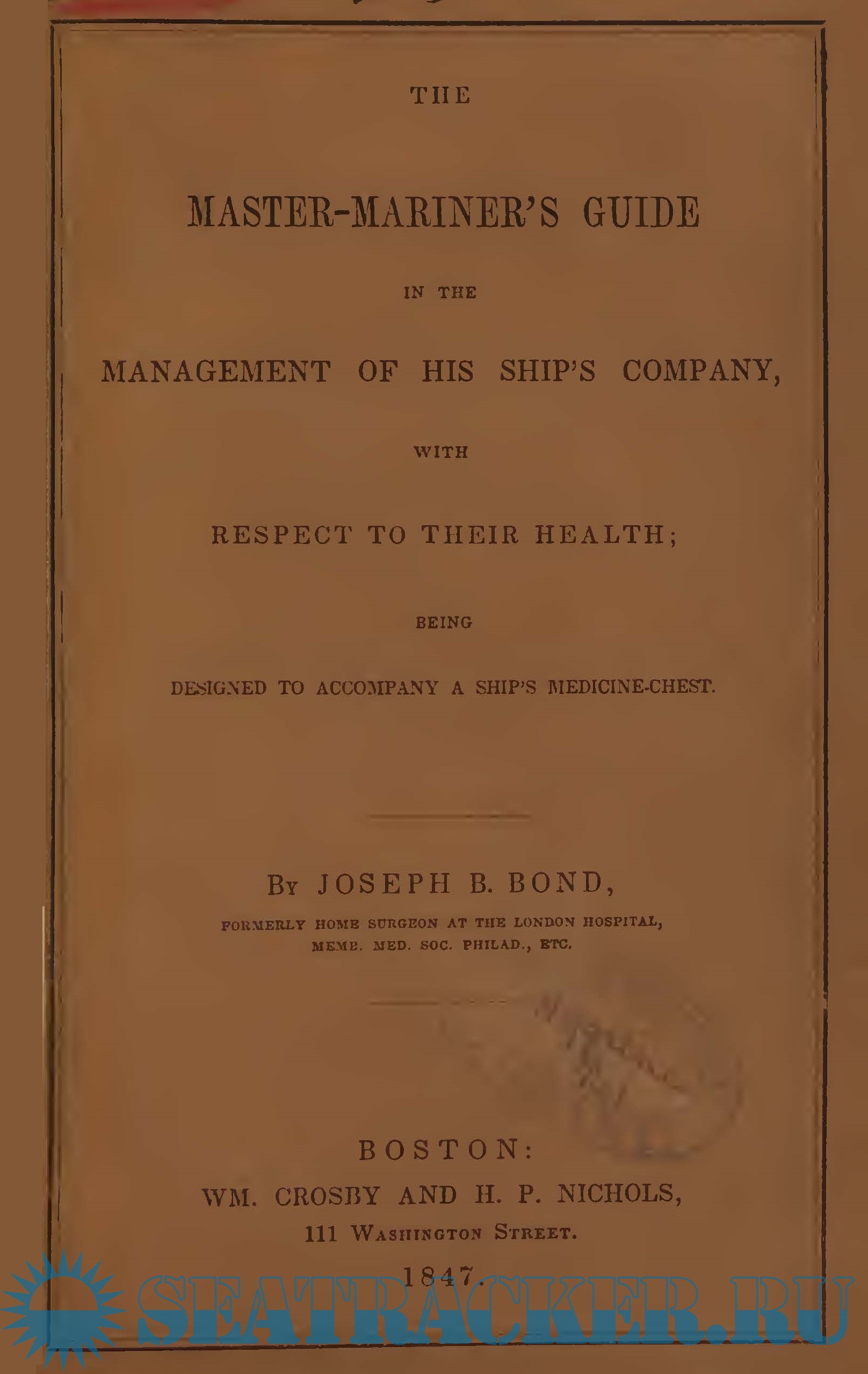 Year: 1847 Language: english Author: Joseph B Bond Genre: Naval Medicine Publisher: Crosby and H.P. Nichols Edition: 1st ISBN: 62610210R Format: PDF Quality: Scanned pages + text layer Pages count: 74 Description: This little work is to supply the deficiency which must have been felt by every ship-master, having no other guide in the management of disease than the small book of directions usually accompanying medicinechests. It is particularly recommended to the person in whose charge the medicines may be, to read over these directions frequently, so as perfectly to understand them, that in case of sudden emergency he may not be confused, and feel uncertain what to do ; for nothing insures so much success, as well as respect and confidence in those around you, as a calm, decided conduct. * Be quick, but not in a hurry, * Be careful, but not timid, * Be cheerful, but not merry, * Be serious, but not sad.