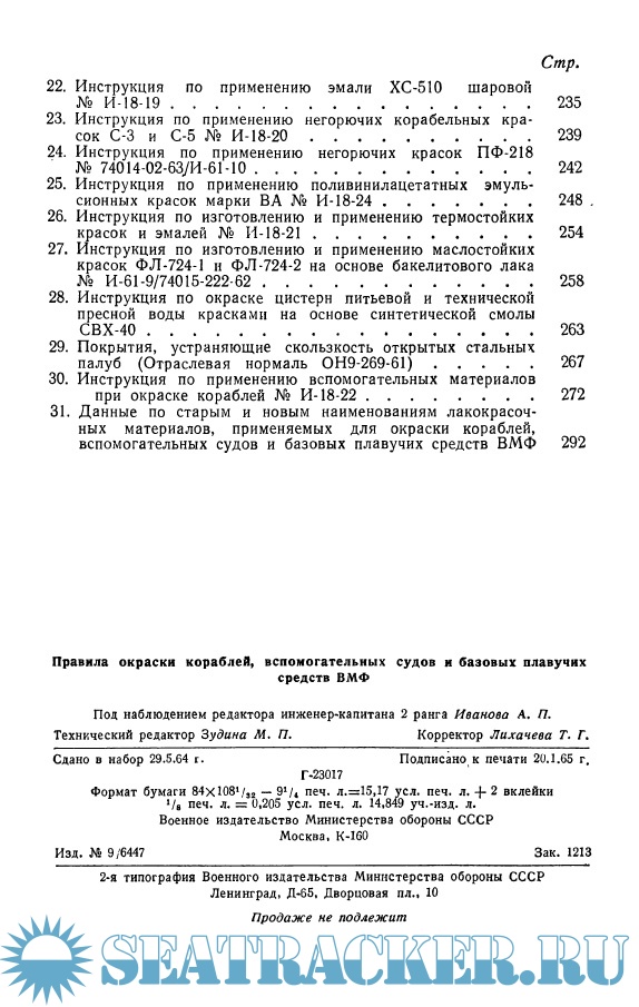 Год выпуска: 1965 Язык: русский Автор: Иванов А.П. (редактор) Жанр: Руководство Издательство: Военное издательство министерства обороны СССР Формат: PDF Качество: Отсканированные страницы Количество страниц: 299 Описание: Настоящие Правила согласованы с организацией п/я 609, Государственным институтом минеральных пигментов Государственного комитета химической промышленности при Госплане СССР, Государственной санитарной инспекцией и распространяются на корабли, вспомогательные суда и базовые плавучие средства ВМФ, ремонтирующиеся на заводах промышленности.