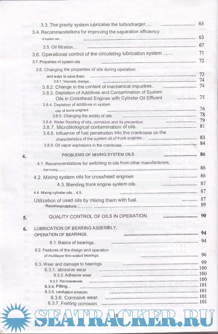 Year: 2007 Language: english Author: I. V. Voznitsky Genre: Technical book Publisher: St. Petersburg Edition: 4th ISBN: 5-94218-010-X Format: PDF Quality: Scanned pages Pages count: 128 Description: This publication is devoted to the problems of lubrication of marine diesel engines and the oils used in them. The role of additives is considered in detail and recommendations are given on the choice of certain types of oils in relation to the level of engine boost, the quality of the fuels used, etc. Considering that oils of foreign companies are mainly used on ships today, along with the classification of oils according to GOST, the classifications adopted in the USA and the European Union are given. Particular attention is paid to the problems of organizing the lubrication of the cylinder-piston group and separately to the lubrication of movement parts. Here, in a systematic way, the reader gets acquainted with the latest recommendations of engine manufacturers and oil manufacturers. Causes of emergency damage and intensive wear and tear, ways to overcome them are shown. Of interest to the reader may be recommendations for changing oils from different manufacturers or mixing them, based on research by British Petroleum, recommendations for the upper limit of alkalinity of circulating oils contaminated with cylinder oil effluents, as well as for limiting values for oil quality indicators in operation. The issues of operation of bearings with thin-walled multilayer shells, the causes of wear and damage and ways to recognize them are considered in detail. Along with information on motor oils, the book provides characteristics of oils for turbine, compressor, hydraulic and heat transfer fluids (thermal fluids). Given that modern oils and fuels are saturated with various chemical compounds that pose a danger to human health, the book includes information about the ways of possible contamination and hygiene measures when working with petroleum products. Additional info: Screenshots translated from russian to english and then compiled into a book for the benefit of english-speaking members of the forum. Apologies for the quality - it's unavoidable in the process of scanning and translating.