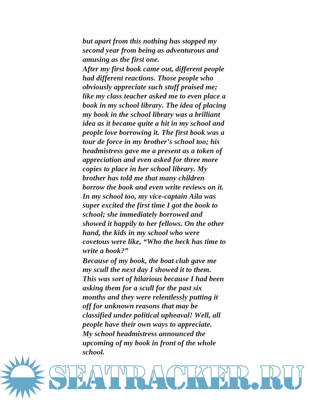 The book explains many psychologically traumatic experiences faced by her, such as witnessing a chopped human hand in the murky Arabian Sea as well as trash snapping oars and damaging boats. It divulges the happy moments too when she wins medals in regattas. Despite all the politics that take place, Javeria does not stop till she achieves her goal. She does not let a few low down people distract her from doing what she is meant to. This book is full of excitement and drama yet some monotonous moments bound to happen while practicing.