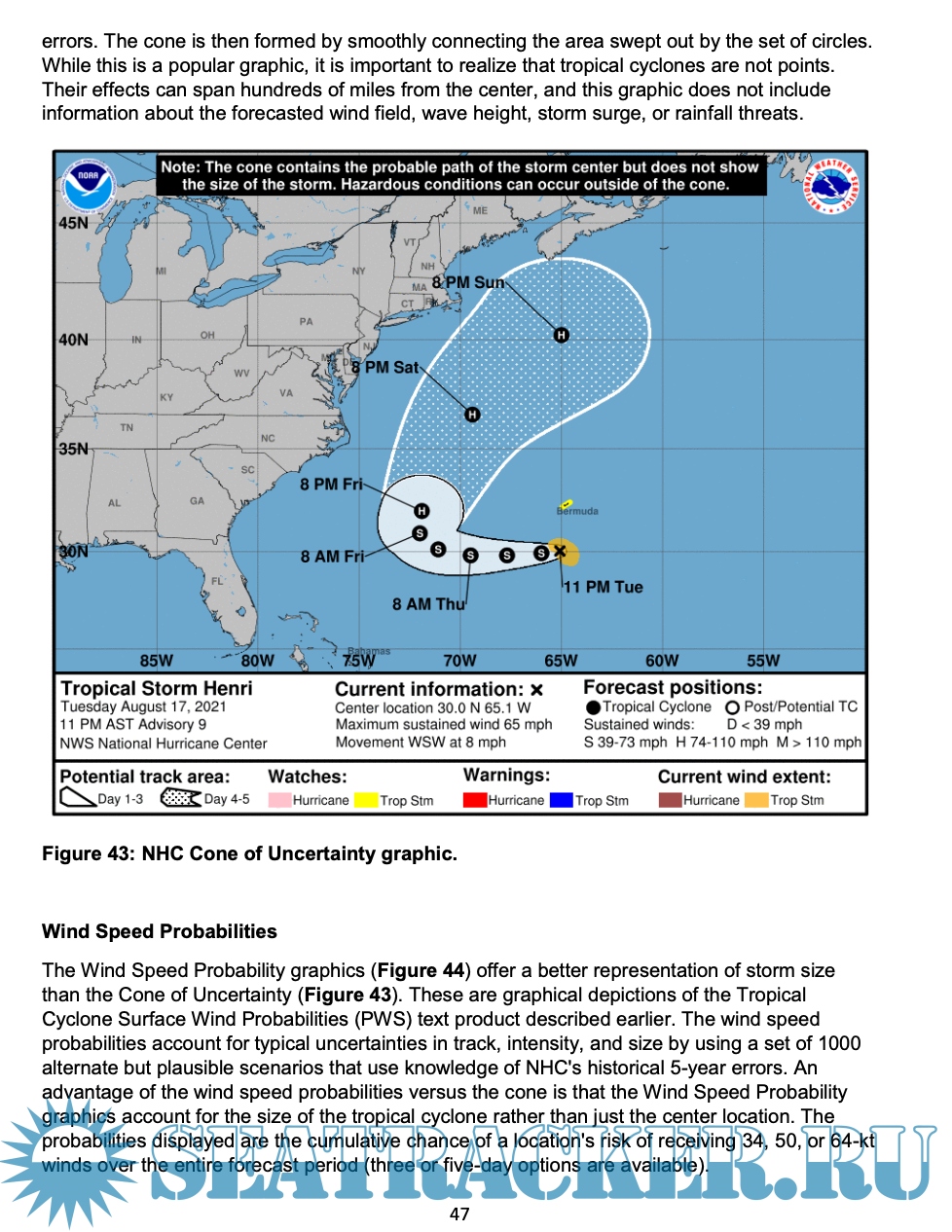 Description: The purpose of this manual is to help mariners avoid experiencing the “awesome fury” described in Bowditch. It was heavily inspired by former National Hurricane Center meteorologist Eric Holweg’s Mariner’s Guide for Hurricane Awareness in the North Atlantic Basin. Mr. Holweg published his guide in the year 2000, when NHC only provided tropical cyclone forecasts to 72 hours, with track errors 2-3 times today’s average and severely limited wind radii guidance.