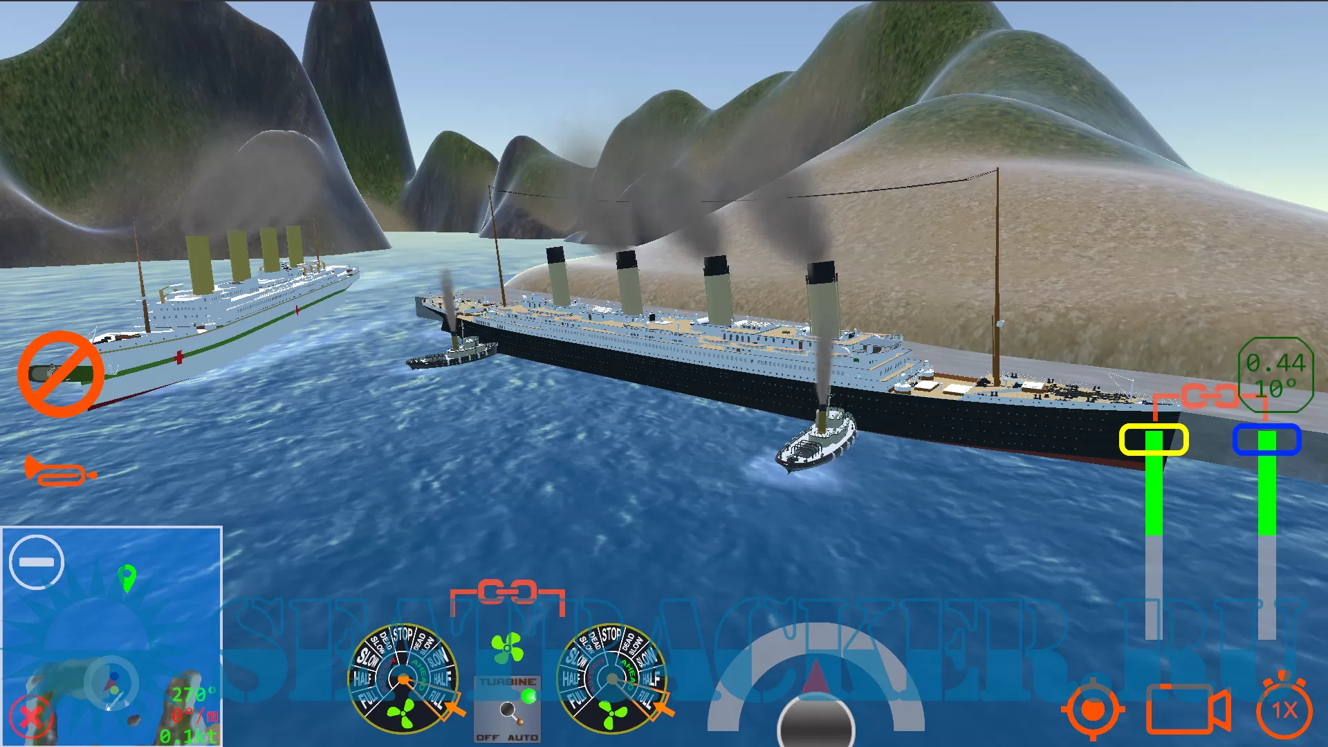 Description: Original simulator of ocean liners - handling, maneuvering and mooring to a pier with tugboats.