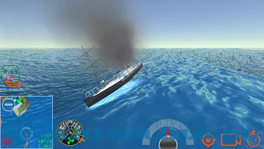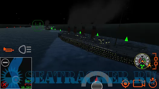 Realistic control of cruise liners, cargo ships, warships, including aircraft carriers from 19th century steamers till modern nuclear.