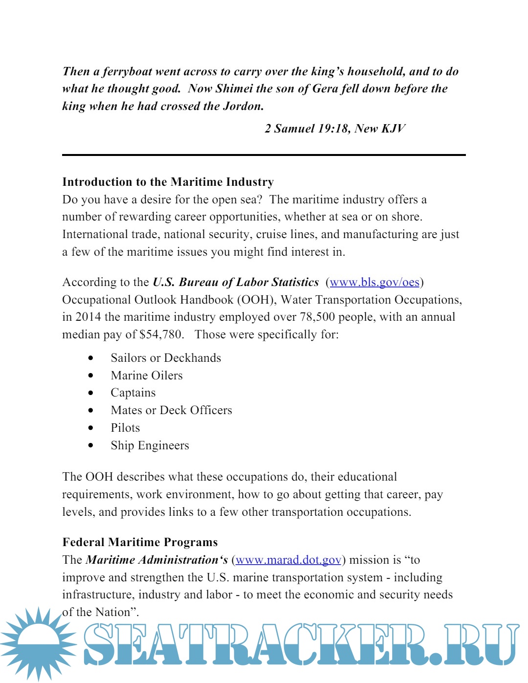 Description: Explore your options for a career in the maritime industry. Out to sea or on-shore, this world-wide transportation mode offers exciting career opportunities. The Maritime career e-Guide is your solution to finding those opportunities NOW!