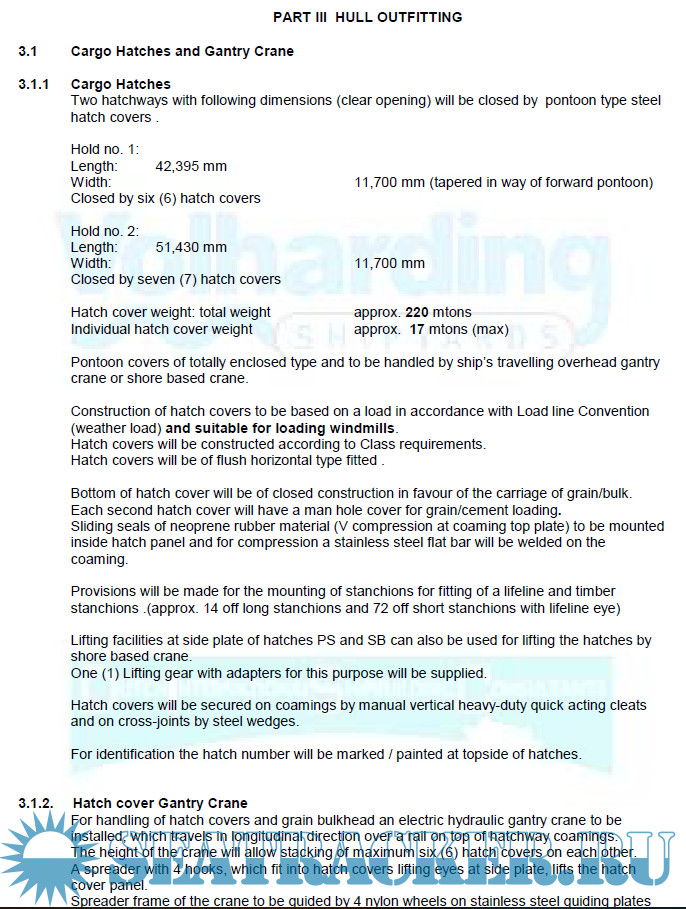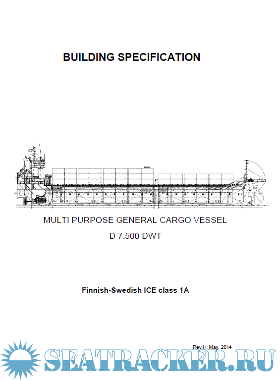 Description: This building specification with accompanying General Arrangement Plan does describe a 7500 dwt Multi Purpose General Cargo Vessel. The vessel will be suitable for carrying general cargoes and bulk cargoes such as coal, grain, etc. and will be designed and constructed following the Bulk carrier standard’s