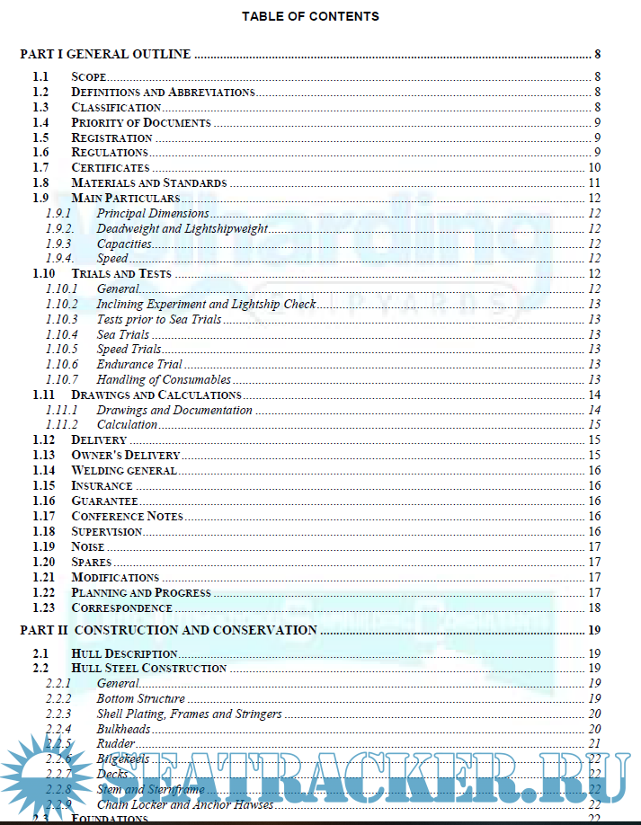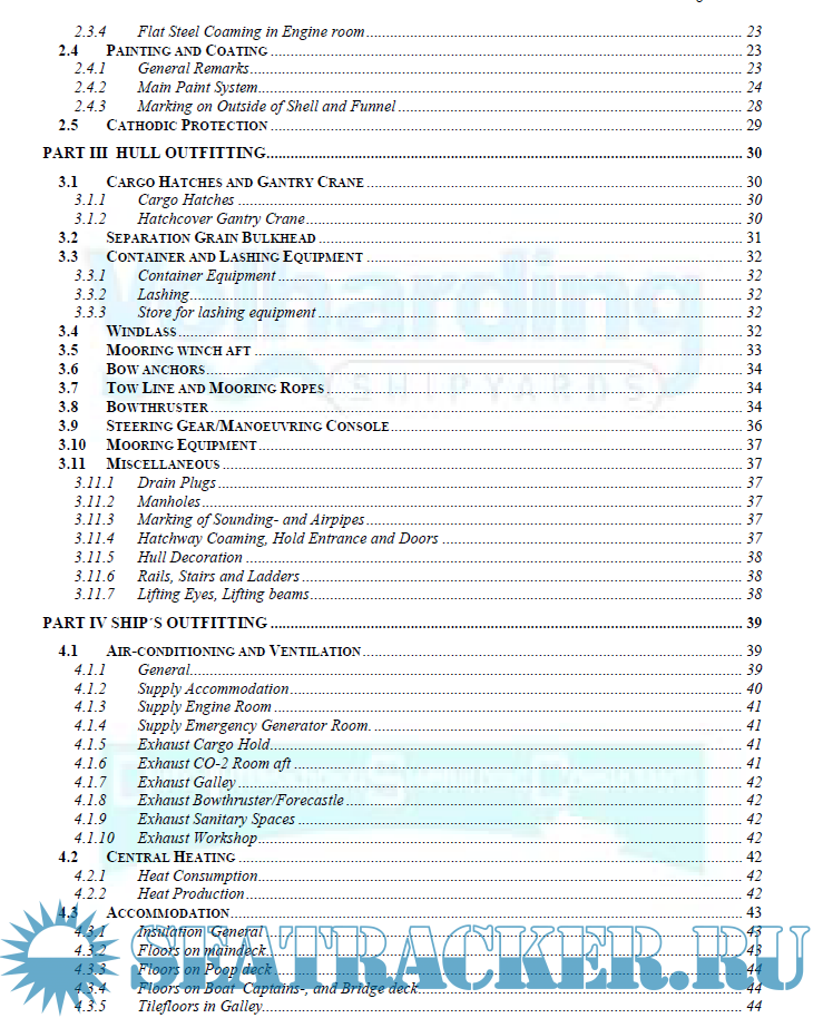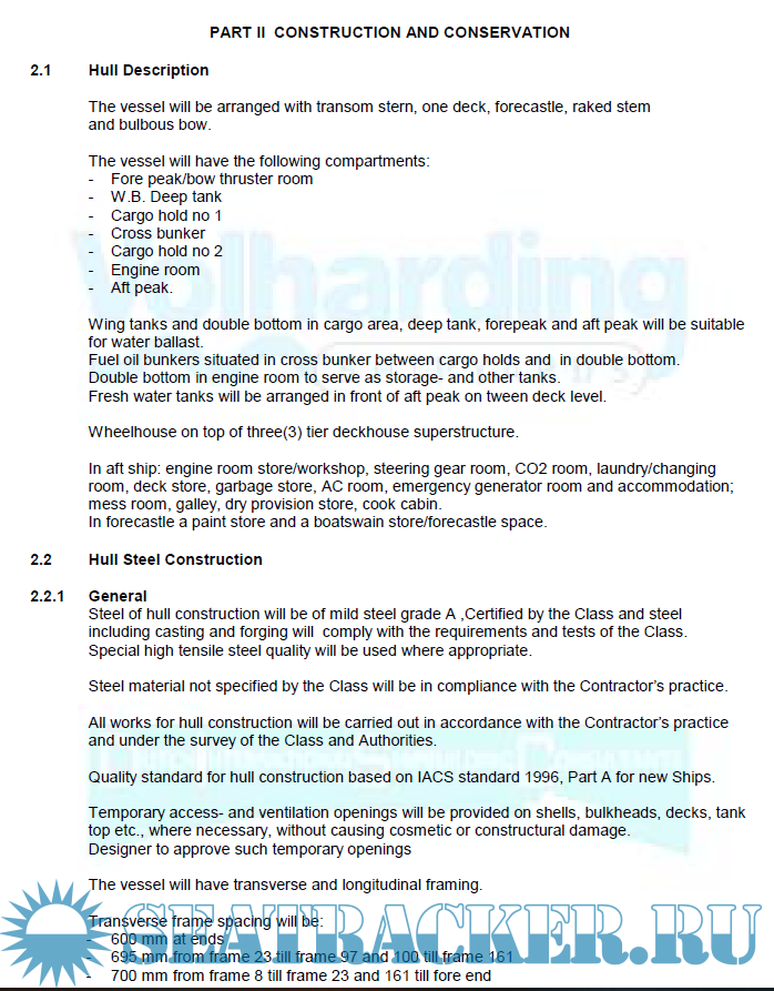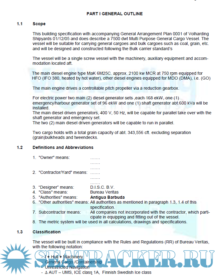 Year: 2014 Language: english Author: Volharding Shipyards Genre: Documentation Format: PDF Quality: eBook Pages count: 126 Description: This building specification with accompanying General Arrangement Plan does describe a 7500 dwt Multi Purpose General Cargo Vessel. The vessel will be suitable for carrying general cargoes and bulk cargoes such as coal, grain, etc. and will be designed and constructed following the Bulk carrier standard’s