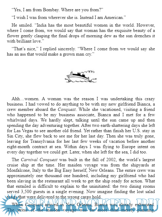 Description: In Cruise Confidential, Brian David Bruns spills the dirt — or in this case, the dirty water — on those romantic, fun-filled vacations at sea. His hilarious chronicle of the year he spent working for Carnival Cruise Lines takes readers down into the areas where the crew works and lives, leaving readers gasping with laughter as they’re assaulted nonstop with events that range from the absurd to the utterly bizarre. Stewards fighting over food. Cutlery allowances and other nonsensical rules. What the crew calls those onboard (no, it’s not “passengers”). And of course, the sex. An abundance of ready, willing, and able bodies eager for action on a vessel replete with nooks and crannies leads to love in some mighty strange, and seemingly impossible, places. Breezy, entertaining, and informative, Cruise Confidential is essential reading for those planning a cruise or for anyone who just needs a good laugh.