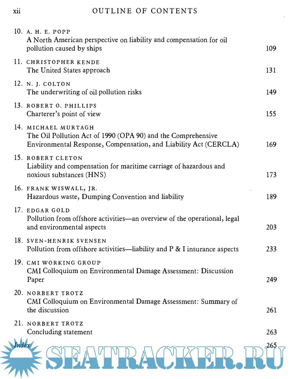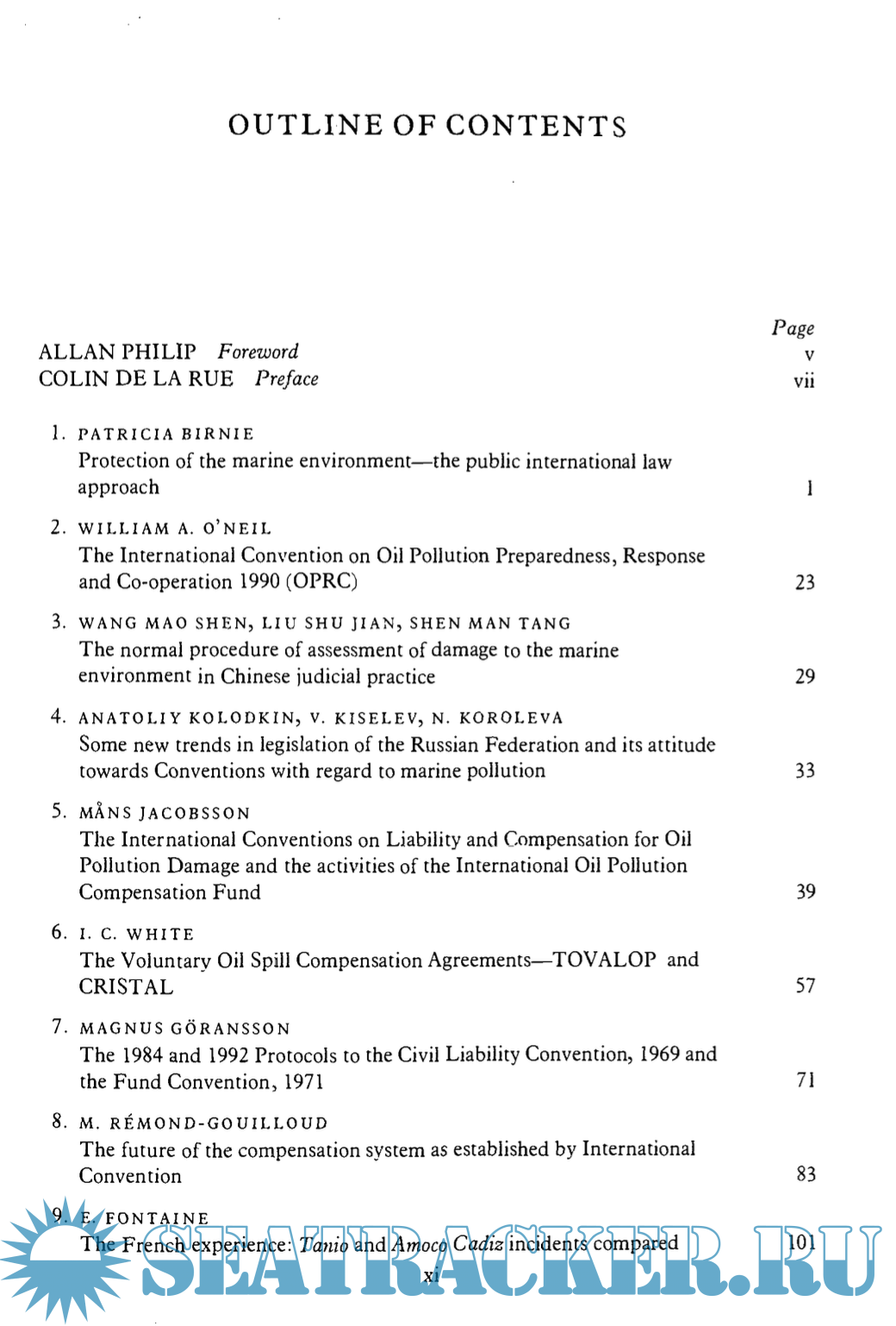 Year: 1993 Language: english Author: Colin de la Rue Genre: Textbook Publisher: CMI Format: PDF Quality: OCR without errors Pages count: 283 Description: Despite widely-accepted international systems of liability for pollution damage to the marine environment, uniformity is far from being achieved. This book is based on the papers delivered at the CMI seminar on liability for pollution damage. The purpose of the seminar was to take stock of the legal position worldwide as a prelude to discussions on unification of laws relating to the admissibility and assessment of claims. Among the main issues addressed are - oil pollution prevention and response, the effectiveness of present compensation methods, the importance of recent protocols to the compensation conventions, the ramifications of OPA 90, the underwriting of oil pollution risks and the need for an international convention on hazardous and noxious substances. These issues are covered by a broad range of international experts.