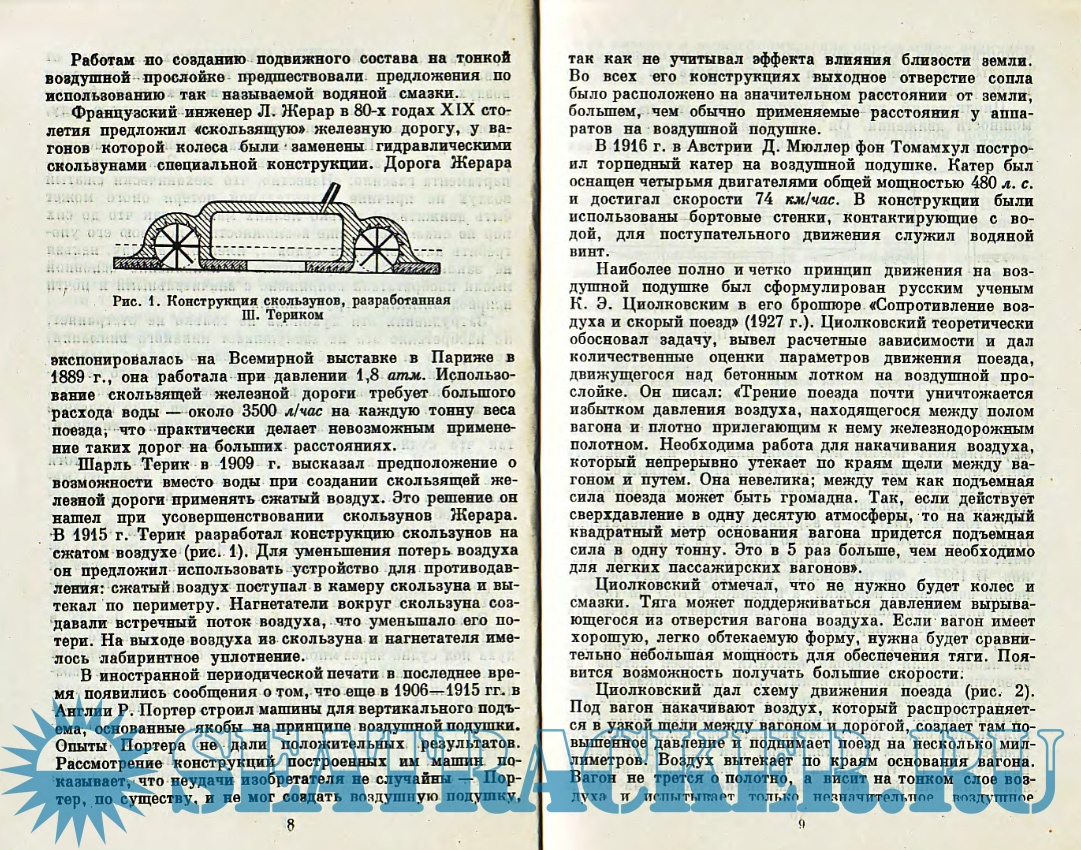 Год выпуска: 1964 Язык: русский Автор: Адасинский С.А. Жанр: Техническая литература Издательство: Наука Формат: DjVu Качество: Отсканированные страницы Количество страниц: 57 Описание: Машины на воздушной подушке - это принципиально новый и самый молодой вид транспорта. Он еще так молод, что машины не имеют определенного названия - их называют вездеходы, автолеты, на западе «ховеркрафты», т. е. парящие машины, в книге мы чаще всего называем их машины (аппараты) на воздушной подушке - это название длинно, но хорошо отражает принципиальную сущность этого средства передвижения. Эти машины не соприкасаются с опорной поверхностью, а висят на тонком слое воздуха - воздушной подушке, поэтому при движении не испытывают сопротивления трения о землю, рельсы или воду, а только сопротивление воздуха, и могут развивать скорости, близкие к самолетным. В условиях нашей обширной страны такие машины особенно перспективны, поскольку для них не существует понятия «бездорожье» - мелководные несудоходные реки, болото, тундра, пашня, лед, снег могут стать трассой для их передвижения. В настоящее время работы по созданию транспортных машин на воздушной подушке находятся в той стадии, когда успешно опробованы несколько десятков опытных аппаратов и начата работа над эксплуатационными образцами.