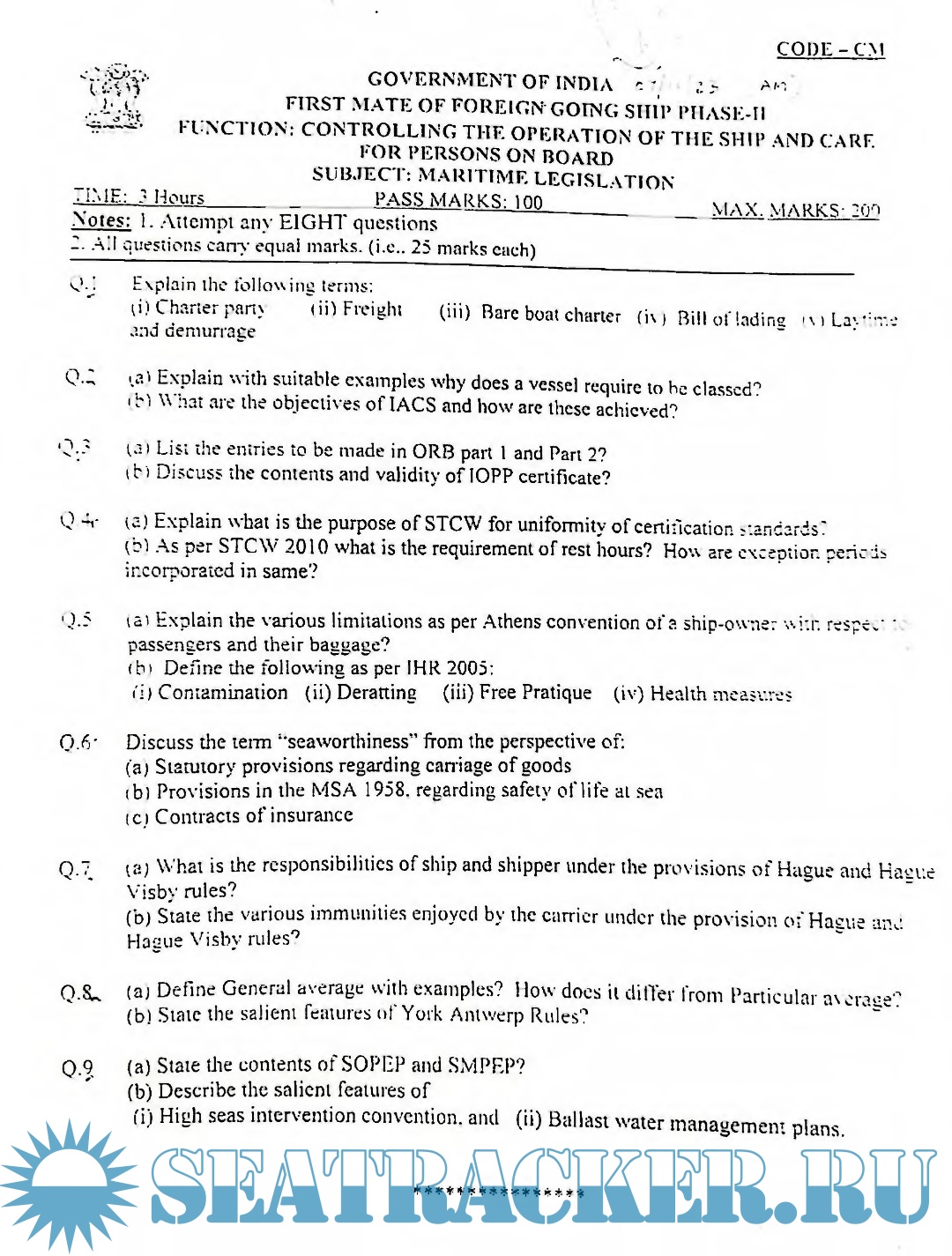 Description: Question paper set for Mercantile Marine Department (MMD), India Exams for Phase II - Chief Mate (F.G.).