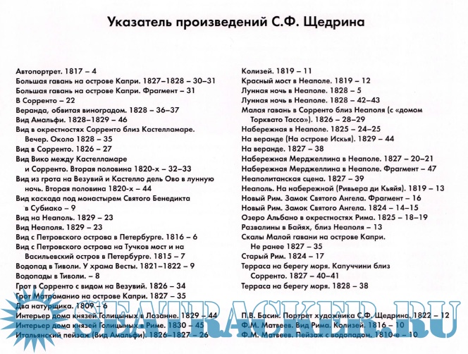 Описание: Сильвестр Щедрин - один из первых русских пейзажистов, получивших европейское признание. Художник, обаяние таланта которого можно назвать уникальным, творил в первой трети XIX века, в эпоху романтизма, но содержание его творчества выходит далеко за пределы своего времени. Образы прекрасной Италии, созданные Щедриным, уже при его жизни стали желанной целью коллекционеров. Во второй половине XIX века произведения русского живописца находились в собраниях Н.Д.Быкова, И.С.Остроухова, Ф.И.Прянишникова, И.Е.Цветкова. Не стал исключением и П.М.Третьяков, в 1860—1880-е годы купивший шестнадцать картин мастера. В настоящее время в Третьяковской галерее хранится более тридцати полотен пейзажиста разных лет, что позволяет во всей полноте представить его творческий и жизненный путь.