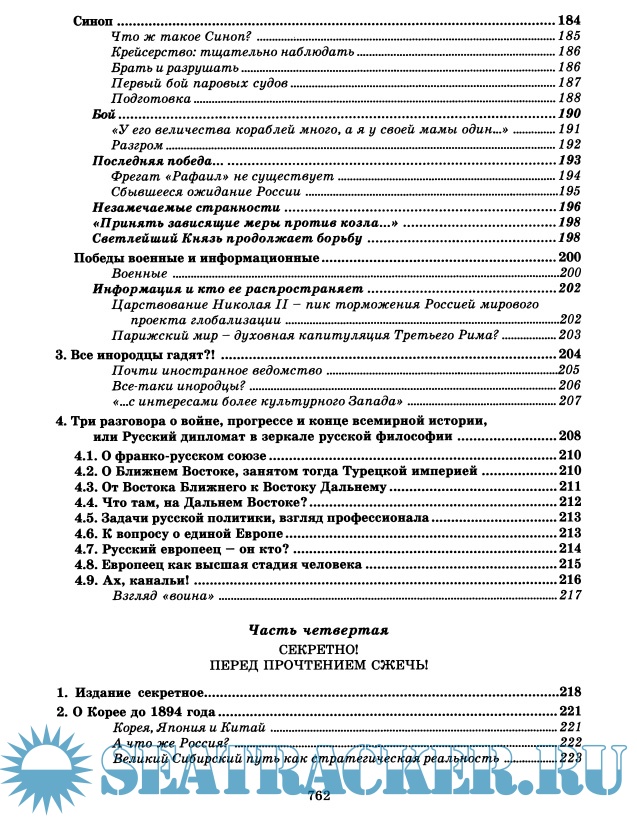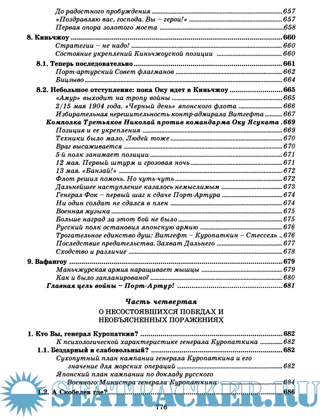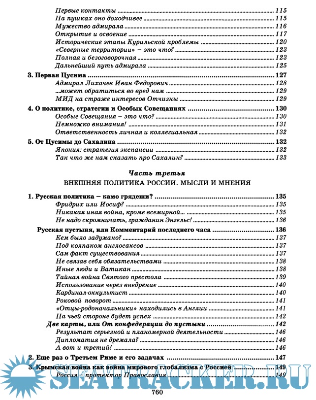 Год выпуска: 2009 Язык: русский Автор: Галенин Борис Жанр: История Издательство: КРАФТ+ Формат: DjVu Качество: Изначально компьютерное (eBook) Количество страниц: 786 Описание: Цусимское сражение — ключевой фактор русской и мировой истории, ее точка ветвления. Для прояснения весьма специфических черт Цусимского боя подробно рассмотрены все значительные боевые действия русского флота в войну 1904-1905 годов. В работе восстановлено действительное развитие событий при Цусиме, в том числе графически воссоздана начальная фаза боя, что можно рассматривать как новое слово в историографии военно-морских сражений и серьезное научное открытие. Результатом проведенного расследования стал вывод, что Цусимский бой, во всяком случае его завязка — первый удар русской эскадры, является несомненной тактической победой русского флота. А Цусима в целом — победой русского воинского духа, не сломленного никакими материальными факторами. Первыми осознали и поняли это японские адмиралы, исказив и извратив в своих донесениях и схемах правду о начале боя. В свете скрываемой до сих пор от мира правды можно понять, почему морской министр победоносной Японии — уже после Цусимы! — отчаянно подталкивал свое правительство «к уступкам во имя заключения мира». В заключение трилогии показано истинное значение русско-японской войны в нашей истории как последней победы Святой Руси.