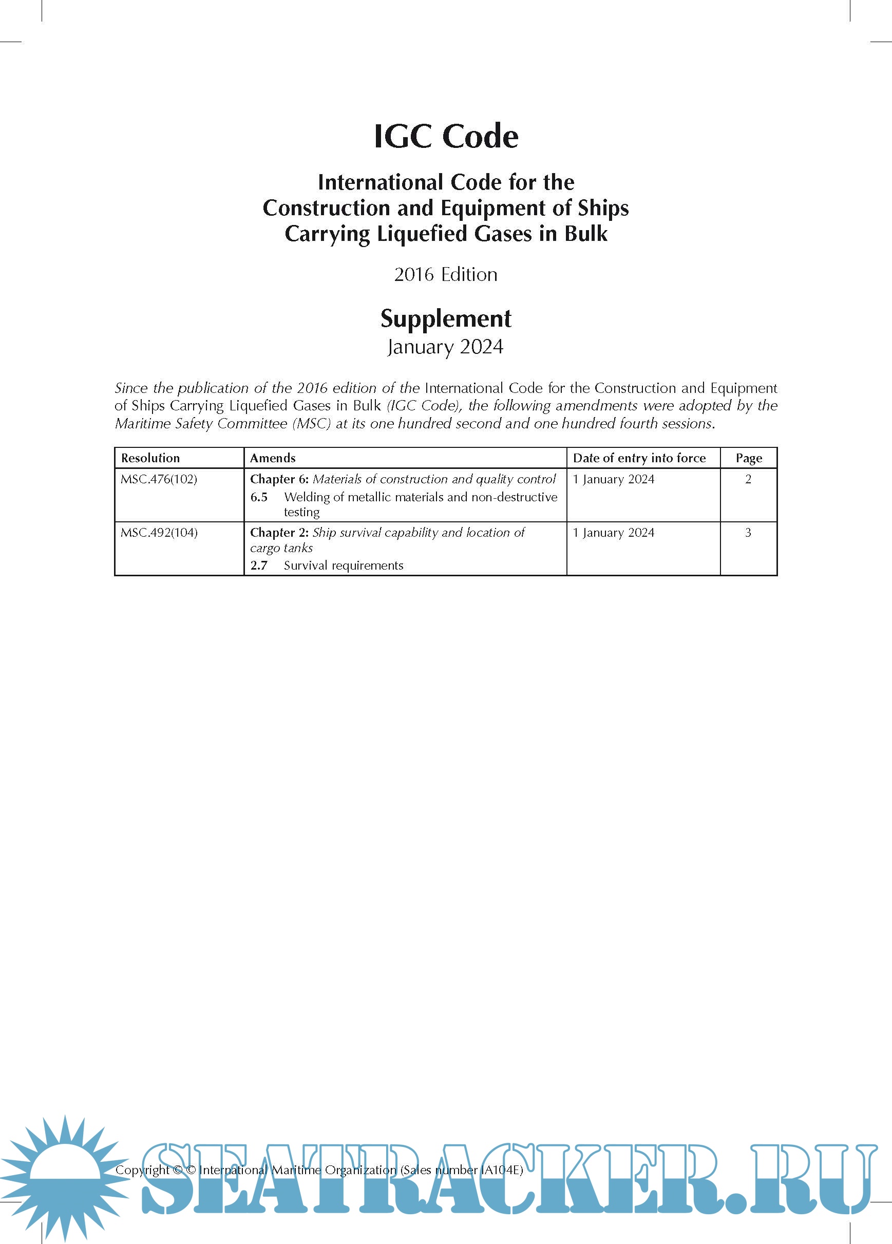 Description: IGC Code International Code for the Construction and Equipment of Ships Carrying Liquefied Gases in Bulk 2016 Edition - Supplement January 2024.