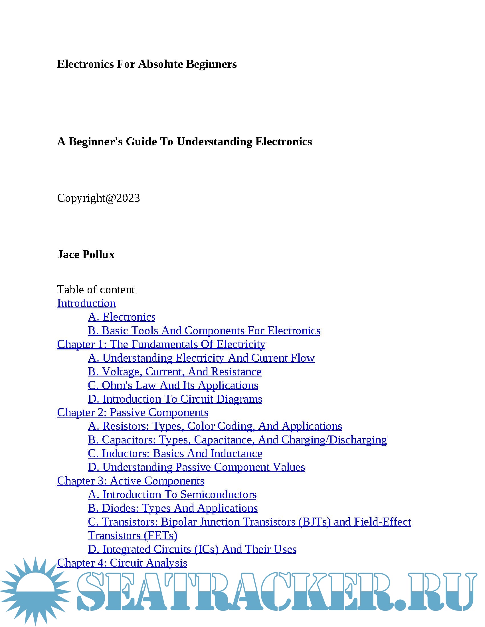 This comprehensive book starts from the very basics, assuming no prior knowledge, making it ideal for absolute beginners. It takes you on an exciting journey, unraveling the secrets of electricity, current flow, and electronic components. With clear explanations and engaging examples, you'll grasp fundamental concepts like voltage, current, resistance, and Ohm's Law.