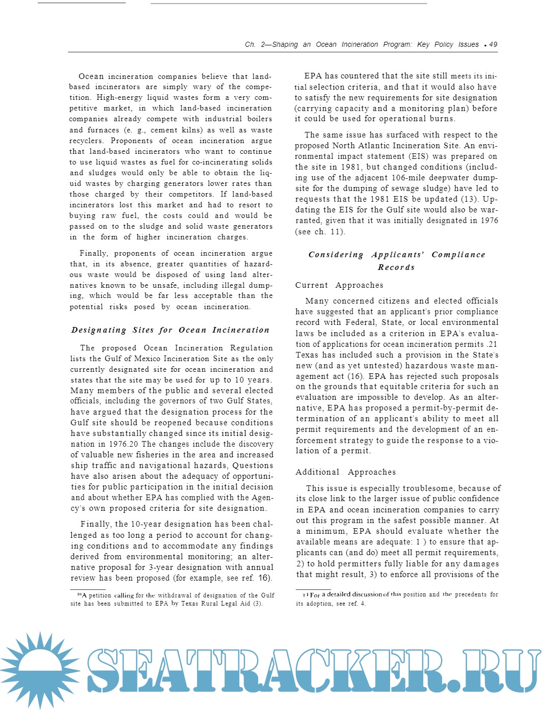 Year: 1986 Language: English Author: Anne Meadows Genre: Technical book Format: PDF Quality: Scanned pages Pages count: 219 Description: This assessment of ocean incineration includes consideration of the adequacy of regulations; risks to human health and the marine environment relative to the risks of comparable activities; existing and emerging alternatives; the capabilities and limitations of ocean incineration in managing hazardous wastes; and how its use might affect efforts to develop superior waste treatment and reduction practices.