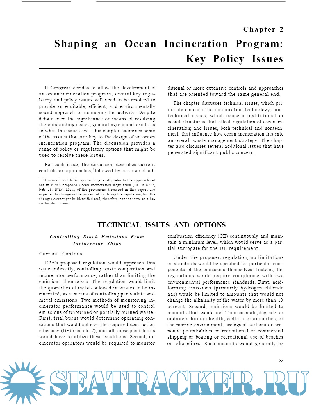 Description: This assessment of ocean incineration includes consideration of the adequacy of regulations; risks to human health and the marine environment relative to the risks of comparable activities; existing and emerging alternatives; the capabilities and limitations of ocean incineration in managing hazardous wastes; and how its use might affect efforts to develop superior waste treatment and reduction practices.