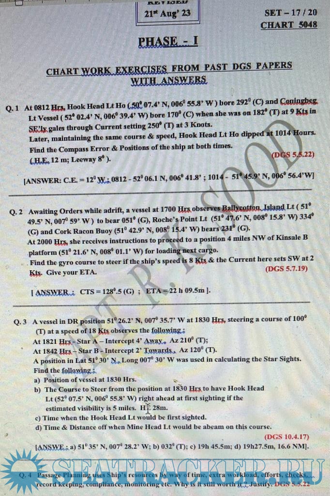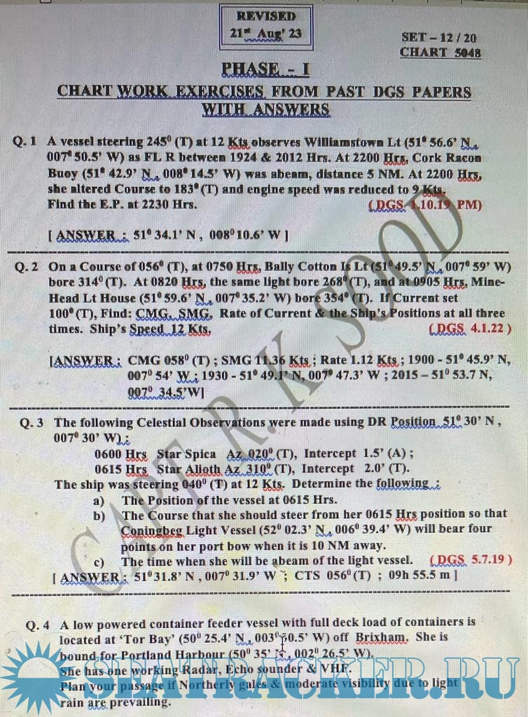 Chart Work Question Set - Updated Aug 2023 with answers for Terrestrial & Coastal Navigation: for Mercantile Marine Department (MMD), India Examinations for Phase I (Chief Mate F.G.)