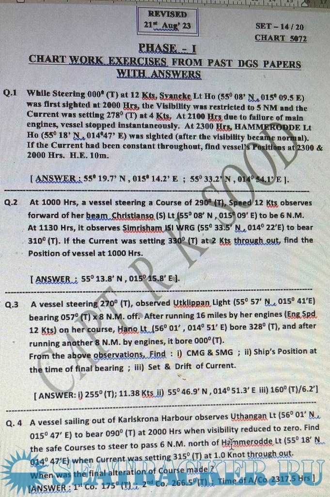 Year: 2023 Language: English Author: Capt RK Sood Genre: Guide Format: PDF Quality: Photo of pages Pages count: 21 Description: Paper : Terrestrial & Coastal Navigation: for Mercantile Marine Department (MMD), India Examinations for Phase I (Chief Mate F.G.) - Chart Work Question Set with answers by Capt. R K Sood. Additional info: Answer set: