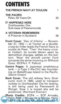 Description: Jean Paul Pallud tells the story of the French Navy, from the British attack at Mers-el-Kebir in July 1940, to the scuttling of the fleet at Toulon in November 1942. The Pacific - Palau 50 Years On - David Green visits the Palau Islands in the Pacific. It Happened Here - Greifswalder Oie: Sub-base of Peenemünde - Dr Peter Schenk visits the tiny island in the Baltic. A Veteran Remembers - A Prisoner in Scotland - Horst Rossberg was captured in France in August 1944 and shipped to England to POW camps in Scotland. He revisits the locations again in 1990 (includes a complete list of POW camps in the UK as at February 1947).