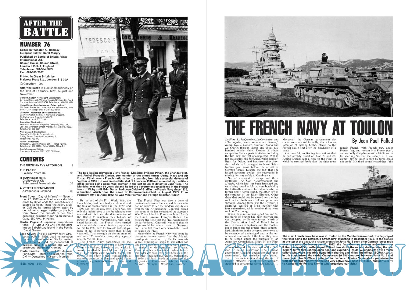 Year: 1992 Language: English Author: Jean Paul Pallud Genre: History Publisher: Battle of Britain International Edition: After The Battle Number 76 Format: PDF Quality: Scanned pages Pages count: 56 Description: Jean Paul Pallud tells the story of the French Navy, from the British attack at Mers-el-Kebir in July 1940, to the scuttling of the fleet at Toulon in November 1942. The Pacific - Palau 50 Years On - David Green visits the Palau Islands in the Pacific. It Happened Here - Greifswalder Oie: Sub-base of Peenemünde - Dr Peter Schenk visits the tiny island in the Baltic. A Veteran Remembers - A Prisoner in Scotland - Horst Rossberg was captured in France in August 1944 and shipped to England to POW camps in Scotland. He revisits the locations again in 1990 (includes a complete list of POW camps in the UK as at February 1947).